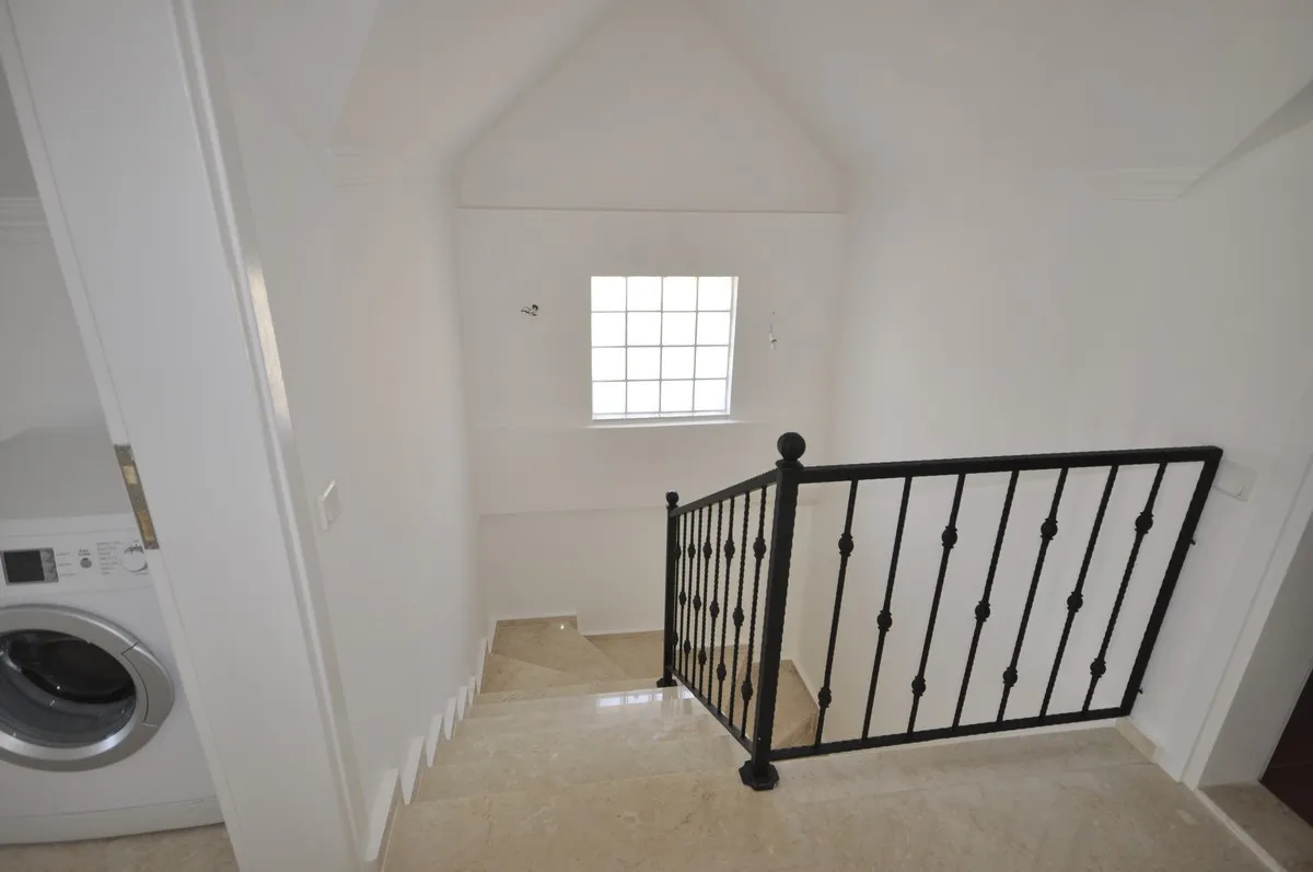 The first floor hosts a master bedroom with an en-suite shower room, two additional double bedrooms, and a modern family shower room. Two bedrooms benefit from private balconies, while the third features an elegant arched window with a French balcony — all enjoying views over the pool area.
