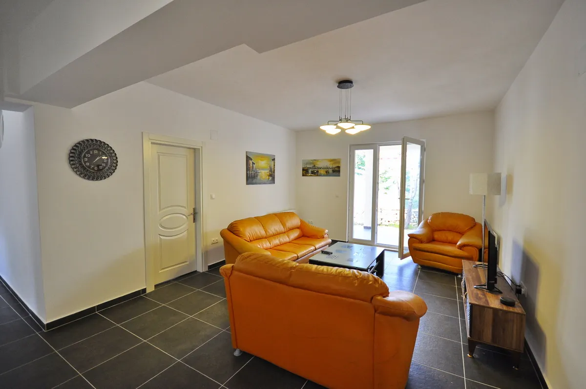 The living area features a fully functioning marble-topped fireplace and double patio doors opening onto a charming terrace overlooking the garden and lower level.