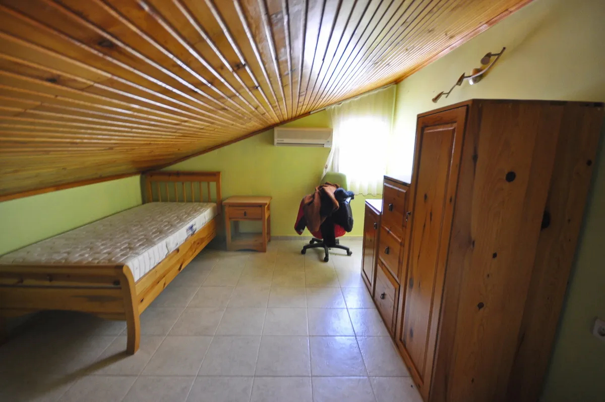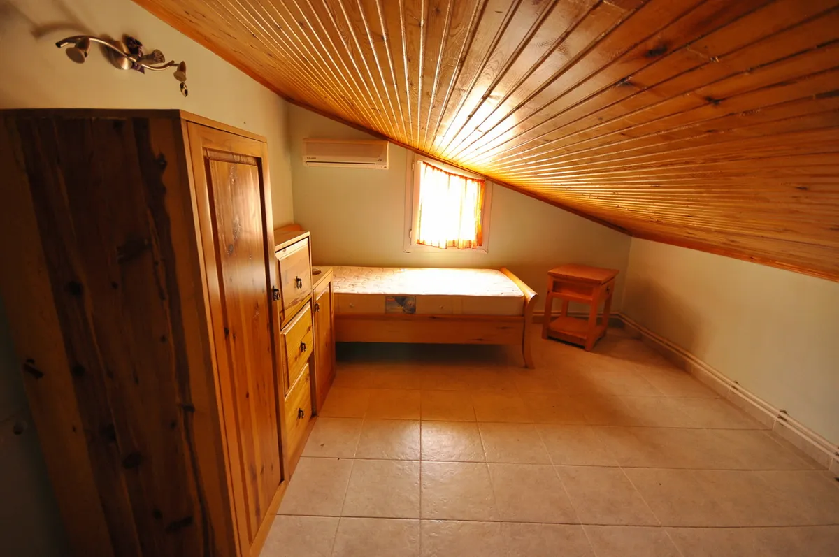The attic level showcases warm wooden beams, unique roof angles, and four additional bedrooms. Some rooms include roof-space storage, while one bedroom offers a balcony with spectacular scenery. A family bathroom is also located on this floor.
