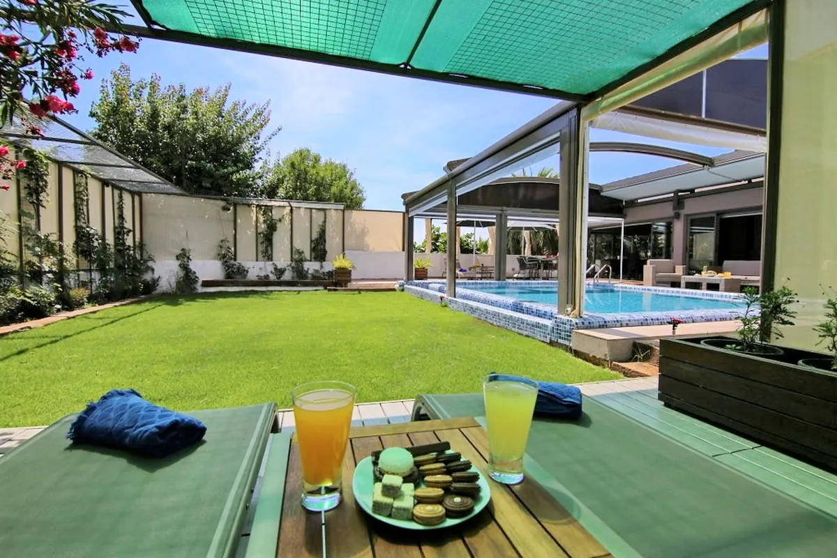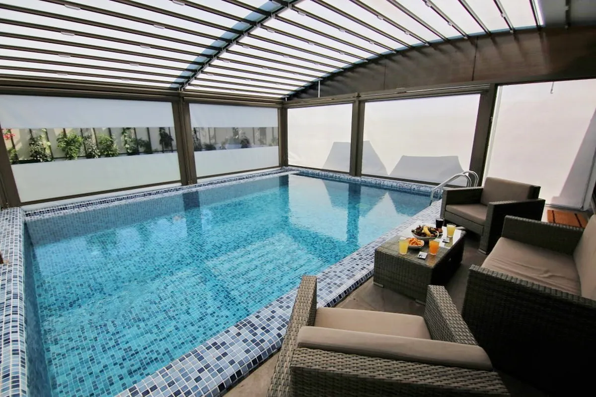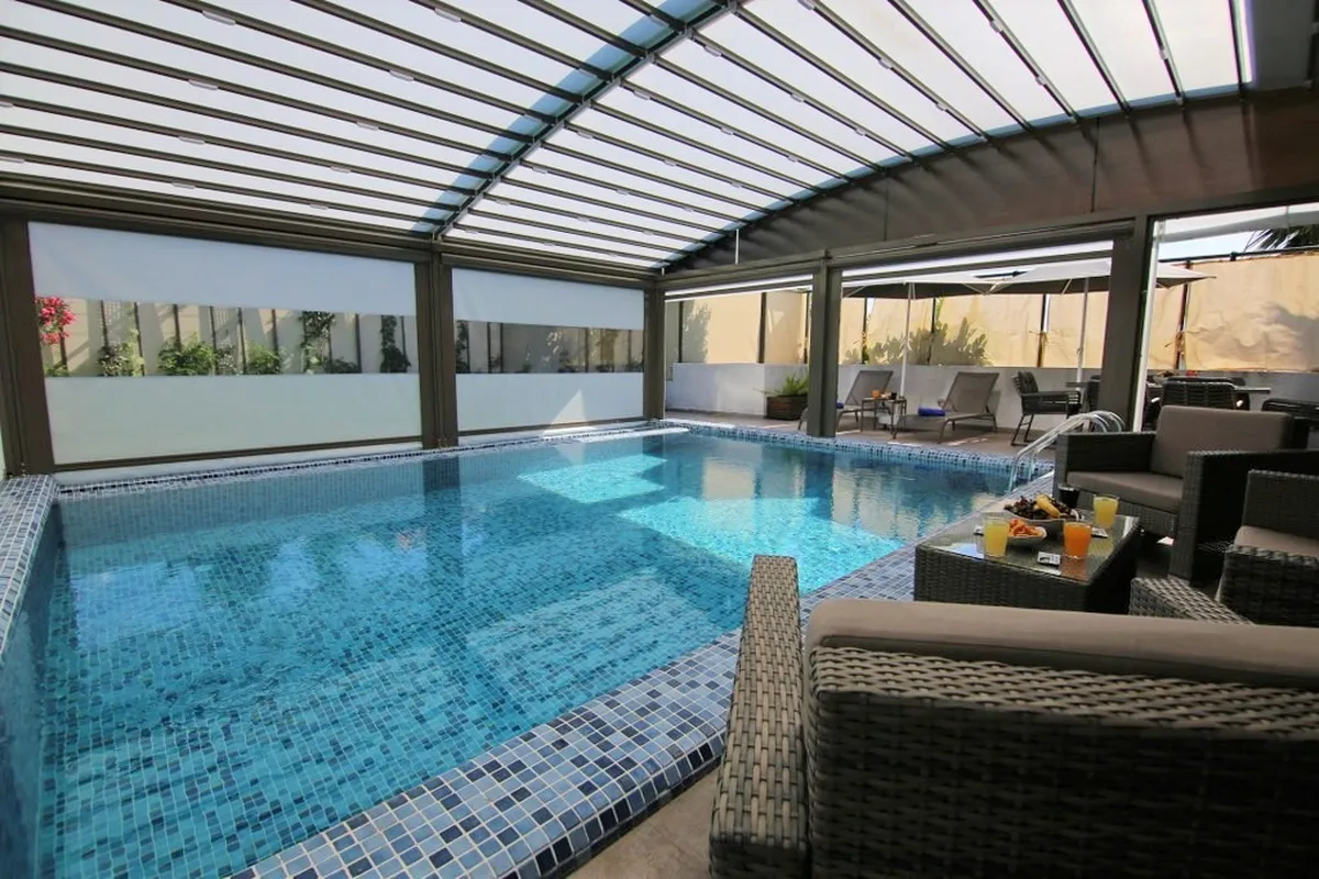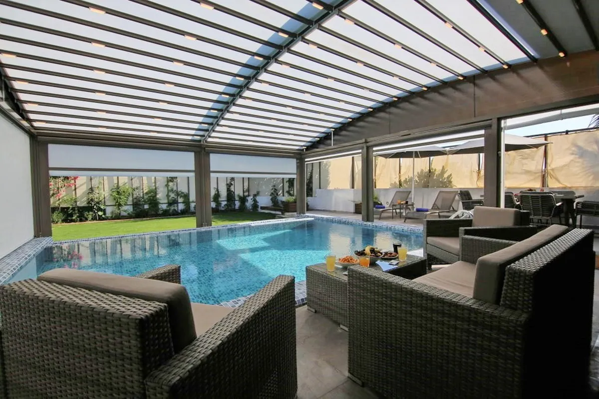 - Heated outdoor pool with remote-controlled enclosure