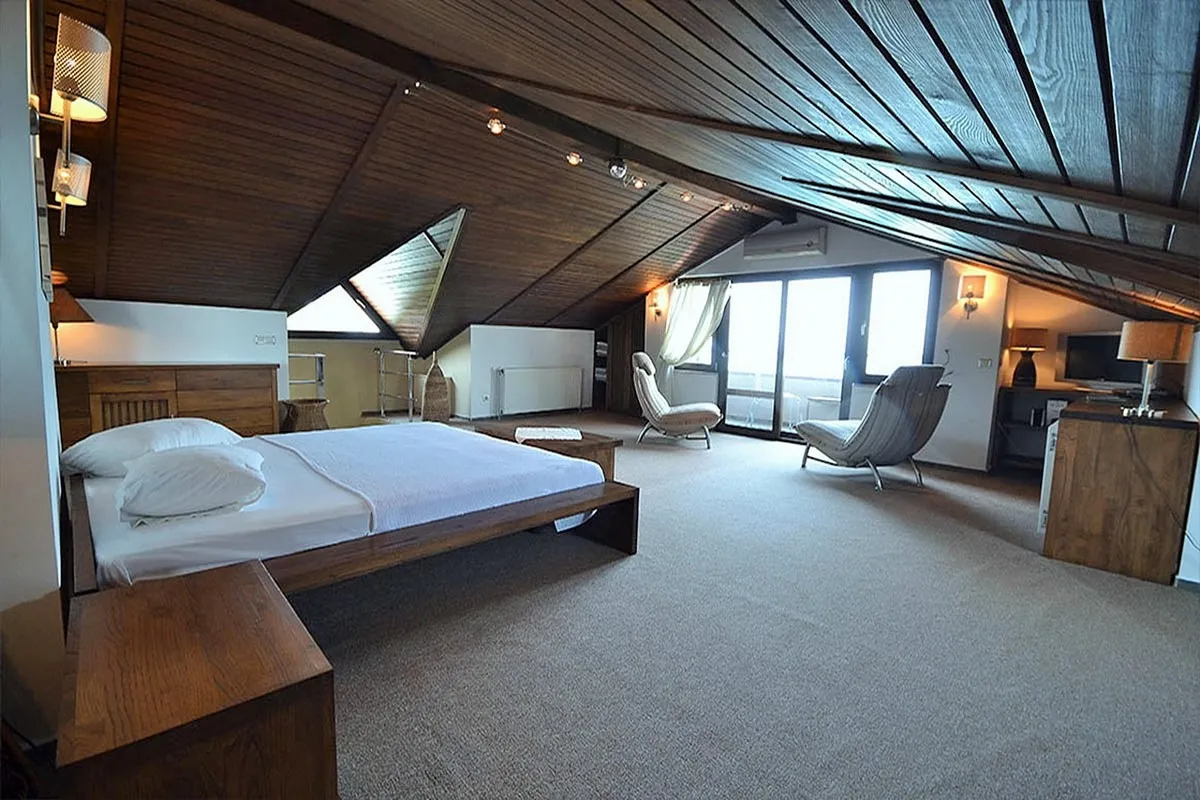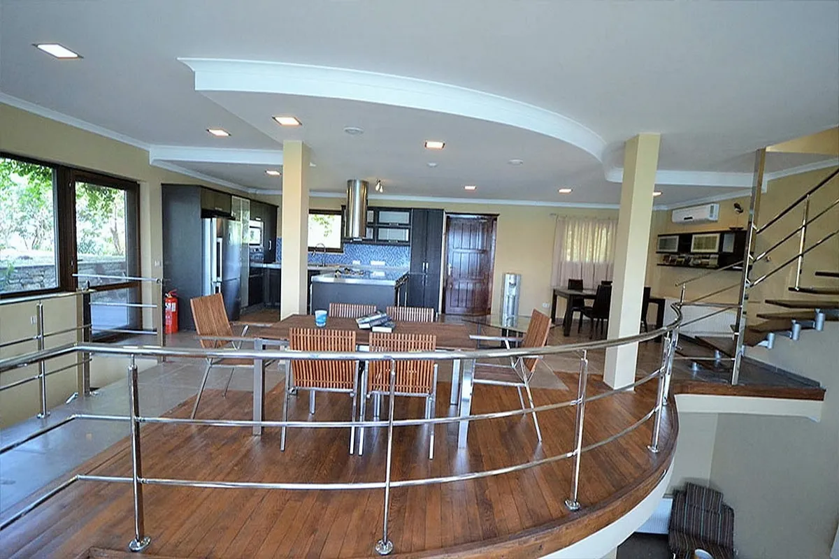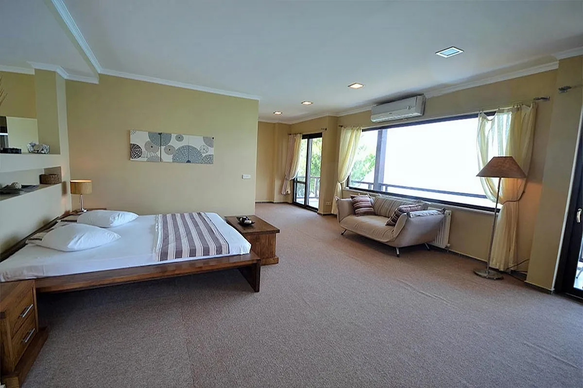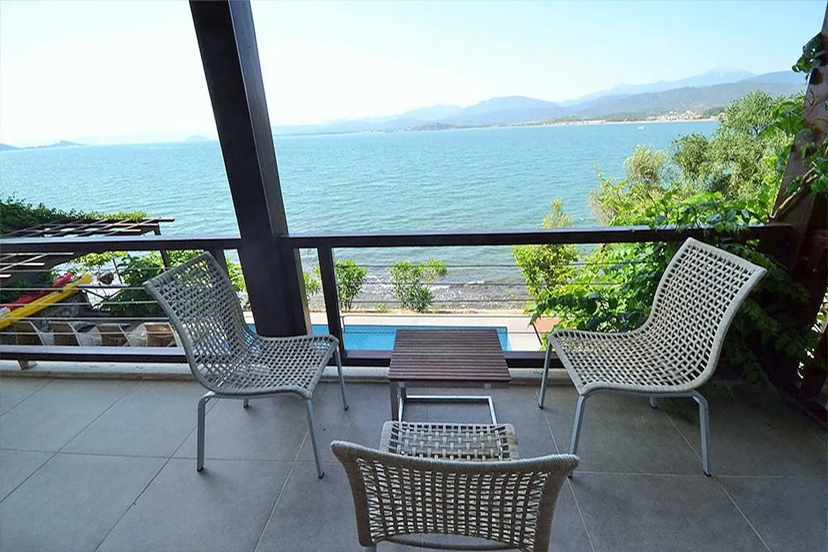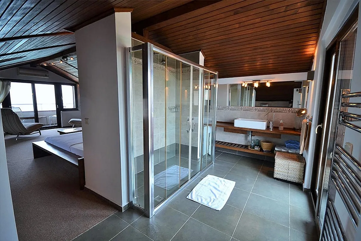 The upper floor hosts a fully equipped modern kitchen and dining area overlooking Fethiye Bay. Each bedroom has been designed for comfort and privacy — two with en-suite bathrooms and one with a jacuzzi.
