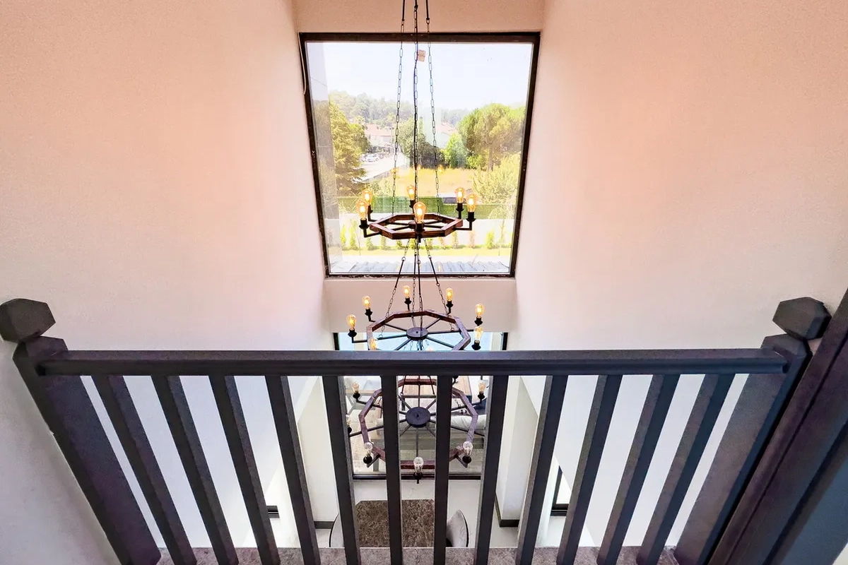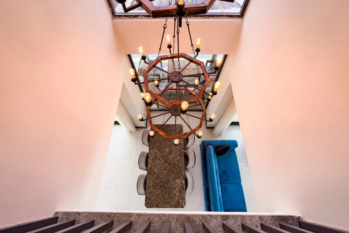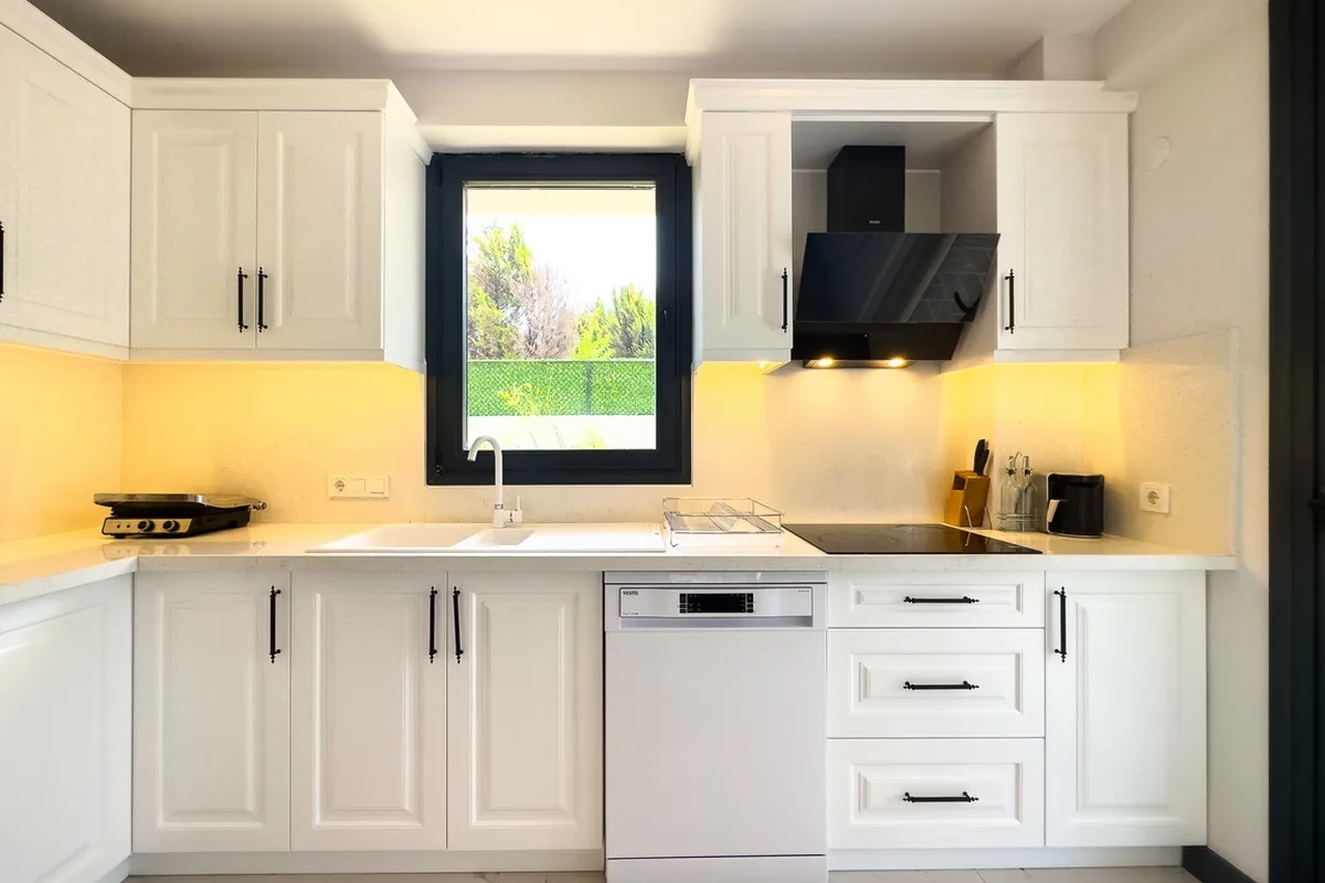 Spacious open-plan living room and dining area, fully fitted modern kitchen, and a front terrace overlooking the private swimming pool. High atrium ceiling allowing plenty of daylight, plus a guest WC.