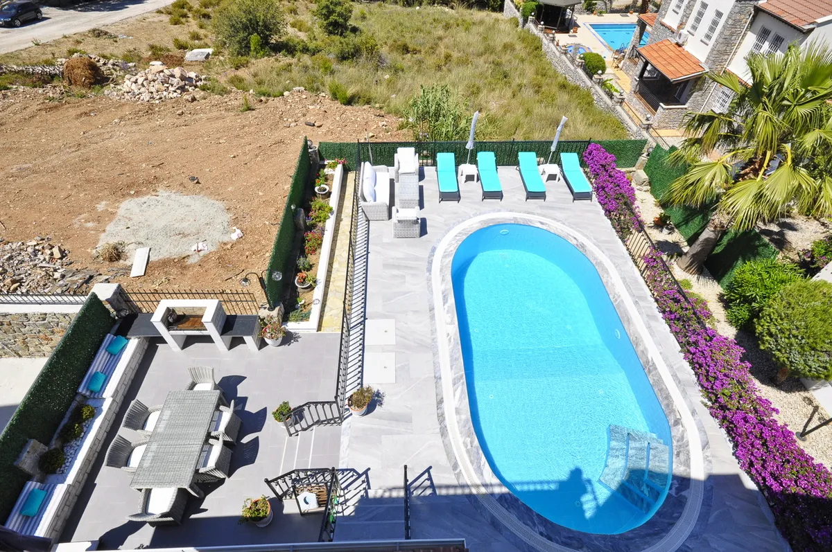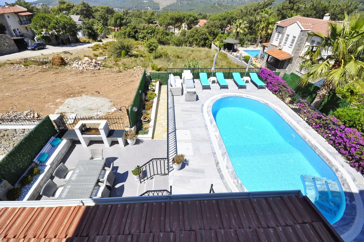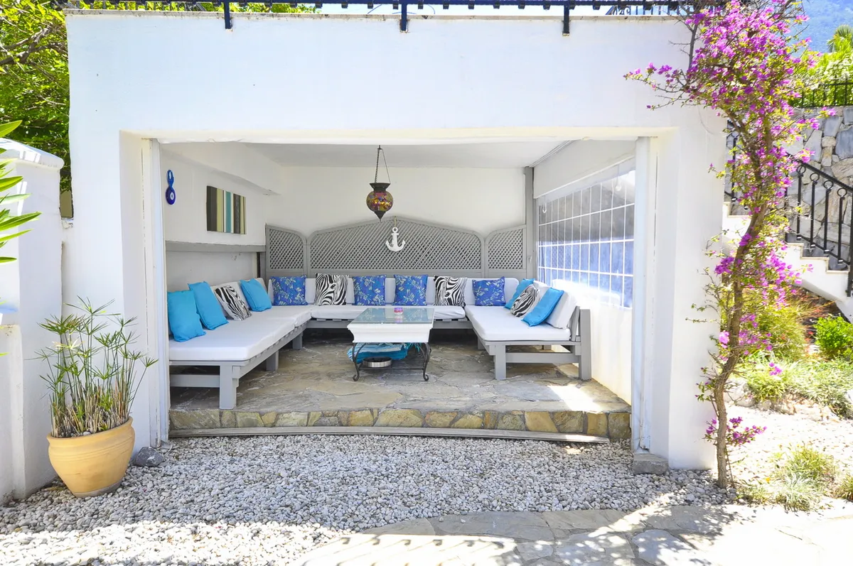 Located in the highly desirable Ovacik area, the villa sits within beautifully landscaped private gardens and features a large private swimming pool, spacious terraces, and charming outdoor living areas.
