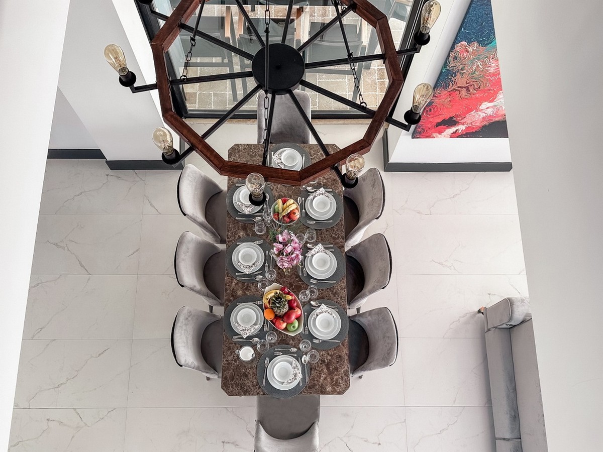 - Ground Floor: Entrance hall, vestibule, guest WC, spacious open-plan living room with modern fitted kitchen & dining area. Large sliding doors lead directly to the front terrace, overlooking the private pool and landscaped garden. The dining area boasts a striking gallery atrium design up to the first floor, creating an airy, light-filled atmosphere.