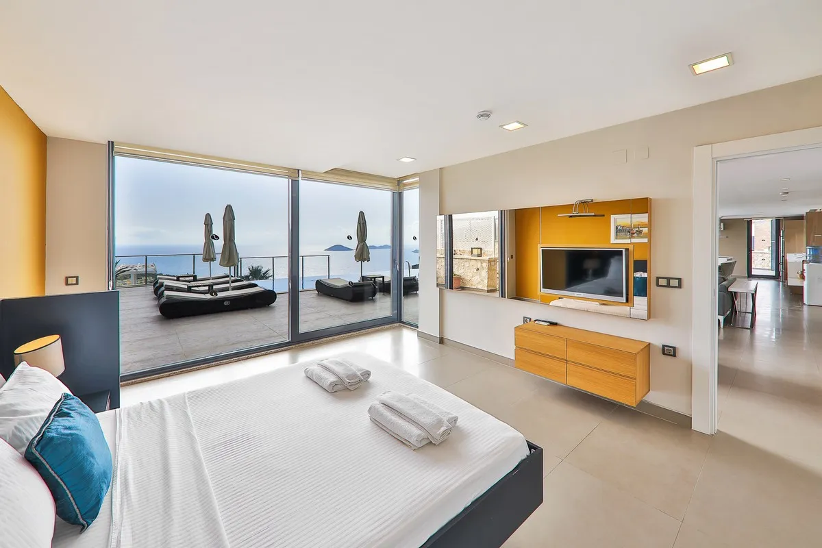 The main floor welcomes you into a bright and spacious open-plan living area framed by floor-to-ceiling windows, ensuring uninterrupted views of the sea and infinity pool. The interior is tastefully decorated with elegant details and premium finishes, exuding calm sophistication. The adjoining en-suite bedroom also enjoys stunning sea vistas and direct pool access.