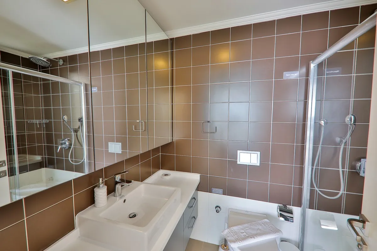 On the first floor, a central atrium overlooks the living room below, enhancing the sense of openness. Here, you’ll find three beautifully appointed en-suite bedrooms, each with a private balcony. The master suite features a luxurious bathroom with a jacuzzi, designed for comfort and indulgence.