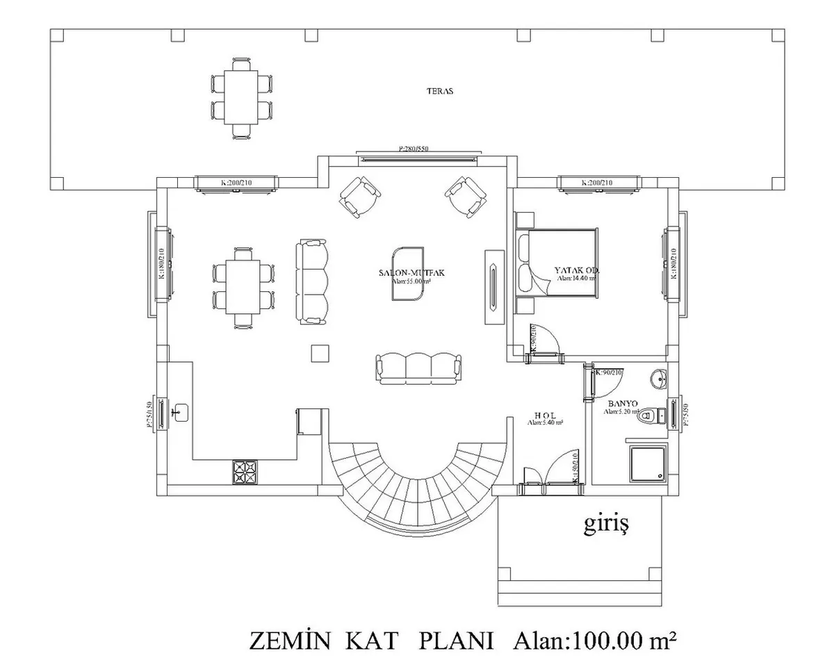 Ground Floor (100 m²): Entrance hall, open-plan living/dining/kitchen, 1 bedroom, 1 bathroom, large front terrace.