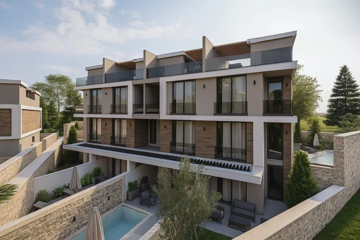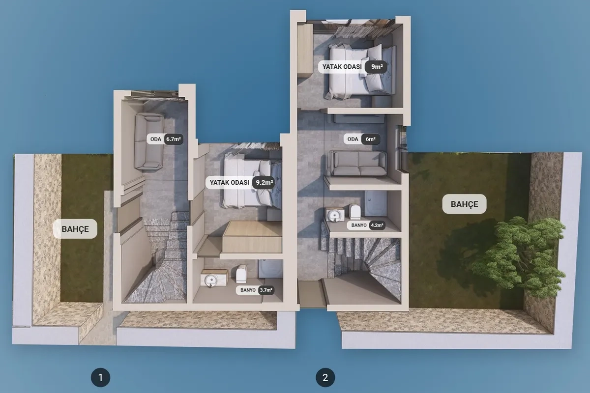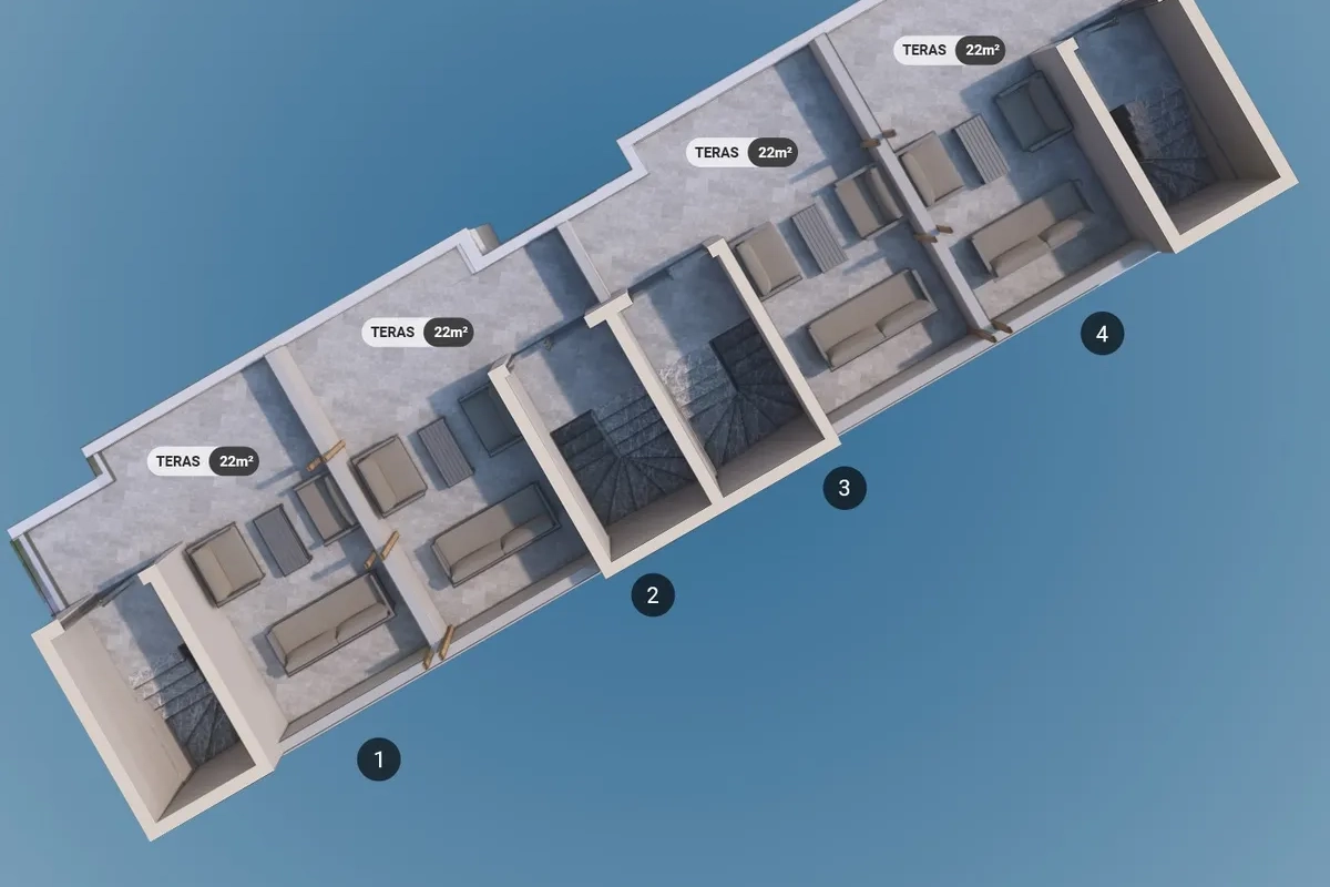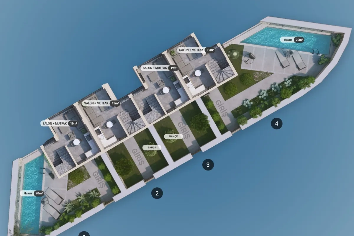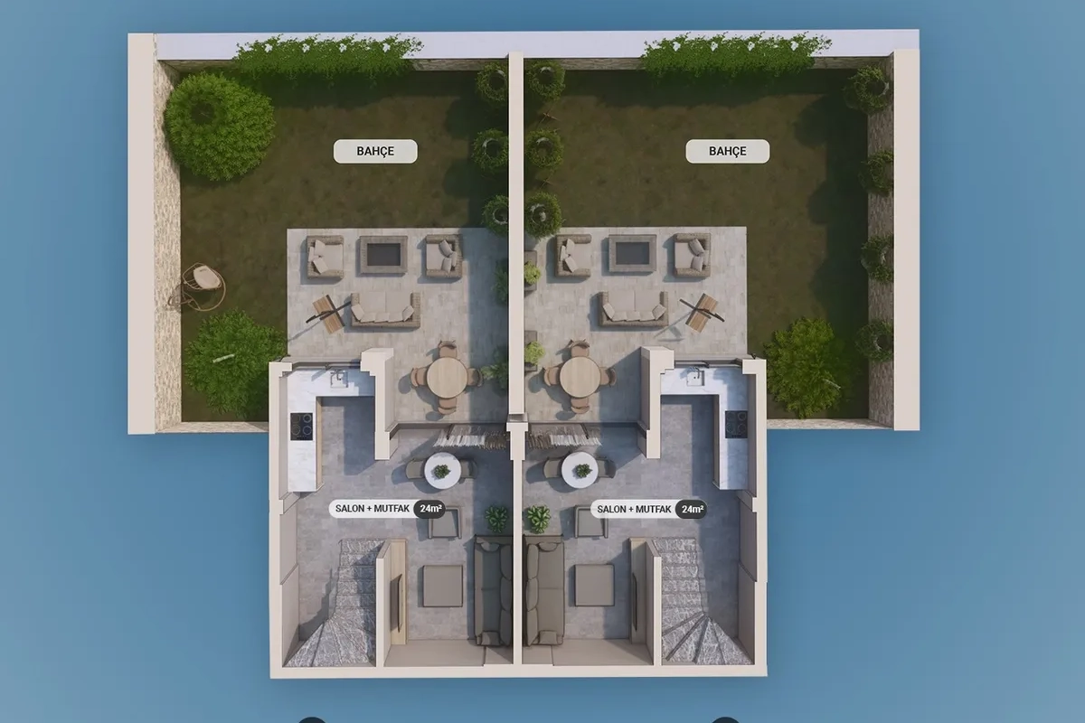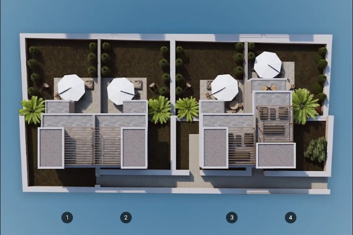 The project includes 12 villas spread across three plots, with a total construction area of 1,737 m². Designed in 2+1 and 2.5+1 configurations, each unit provides an independent entrance along with private outdoor space.
