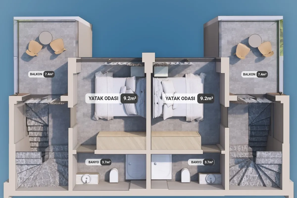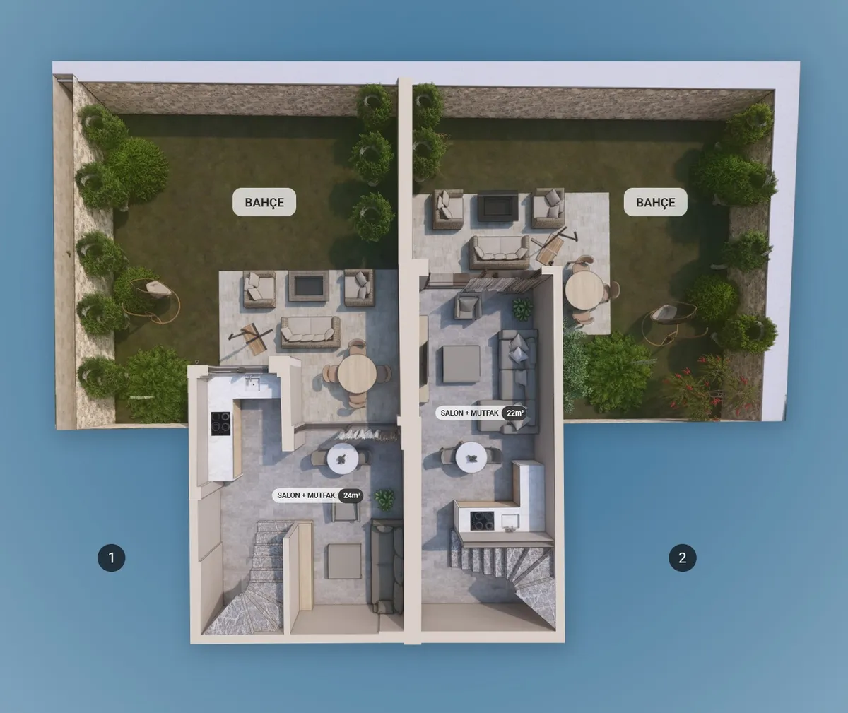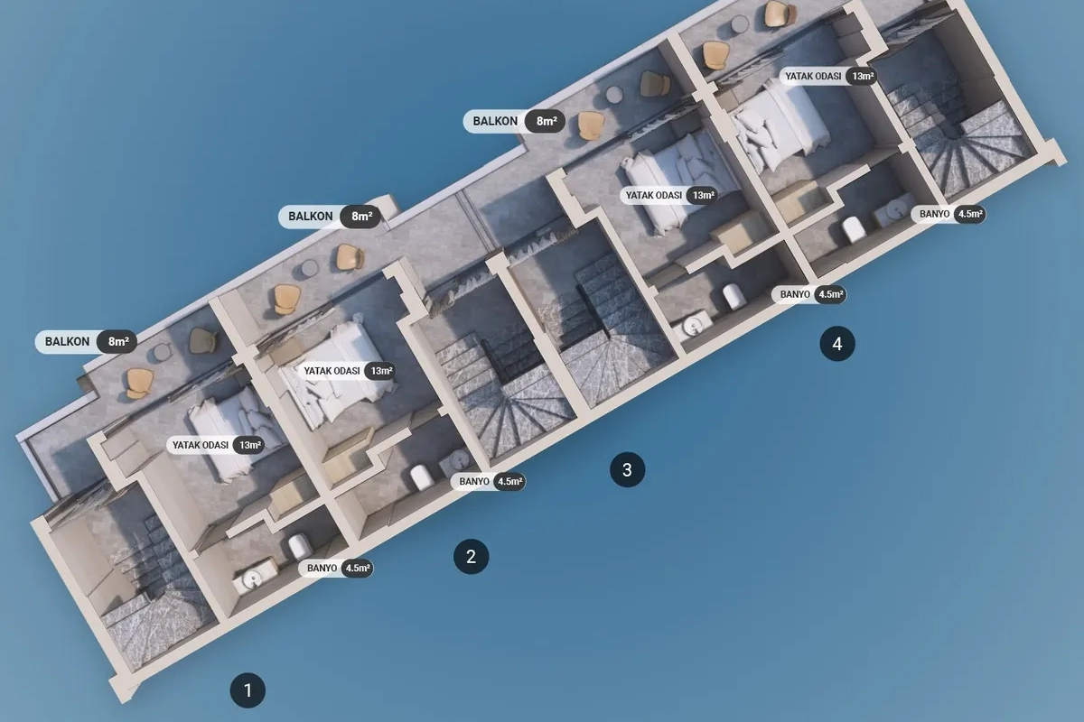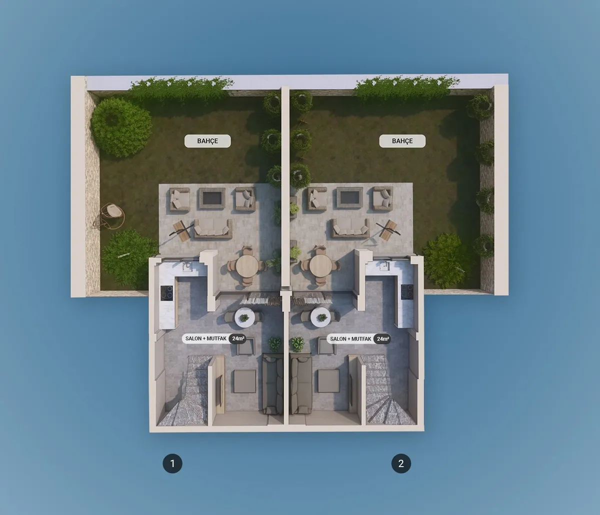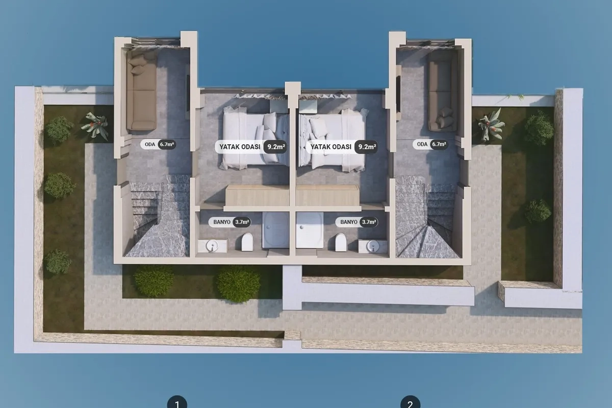 The project includes 12 villas spread across three plots, with a total construction area of 1,737 m². Designed in 2+1 and 2.5+1 configurations, each unit provides an independent entrance along with private outdoor space.