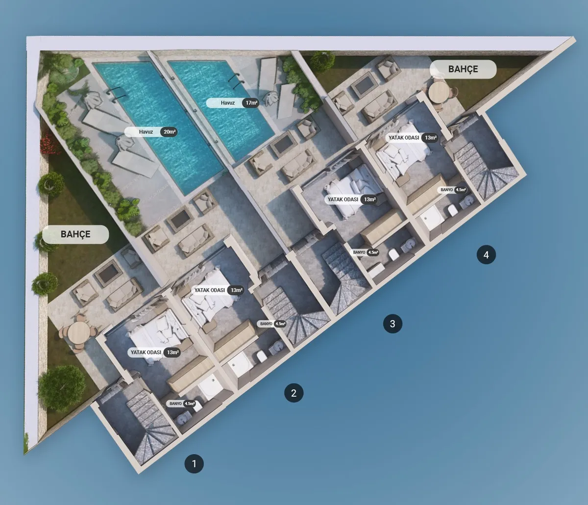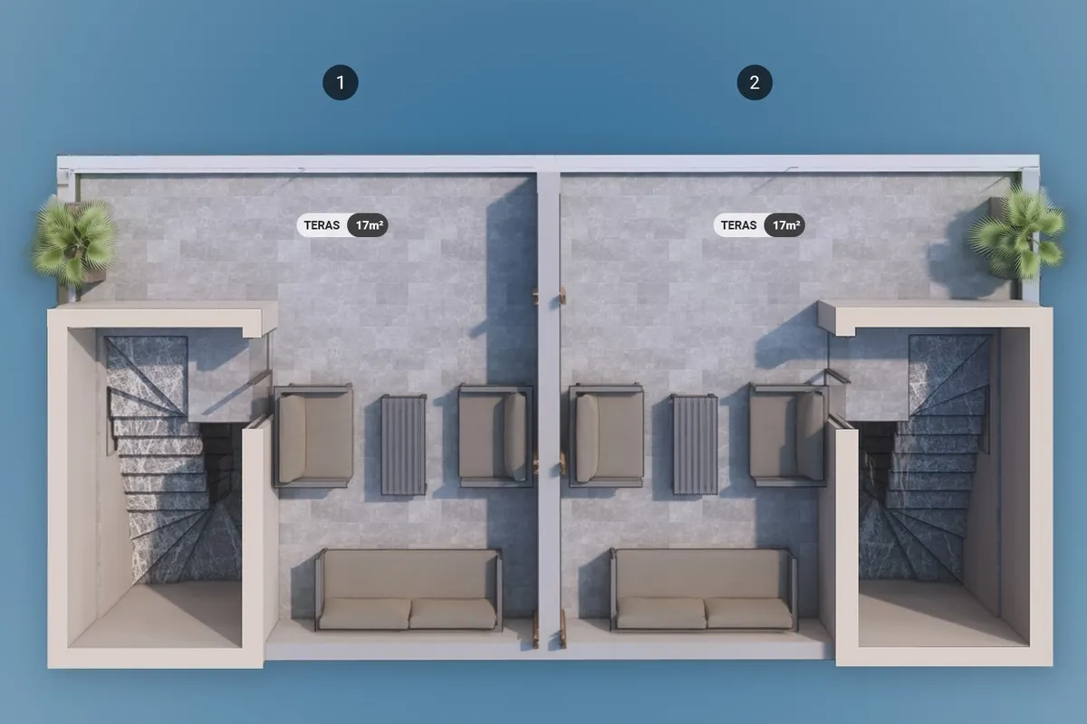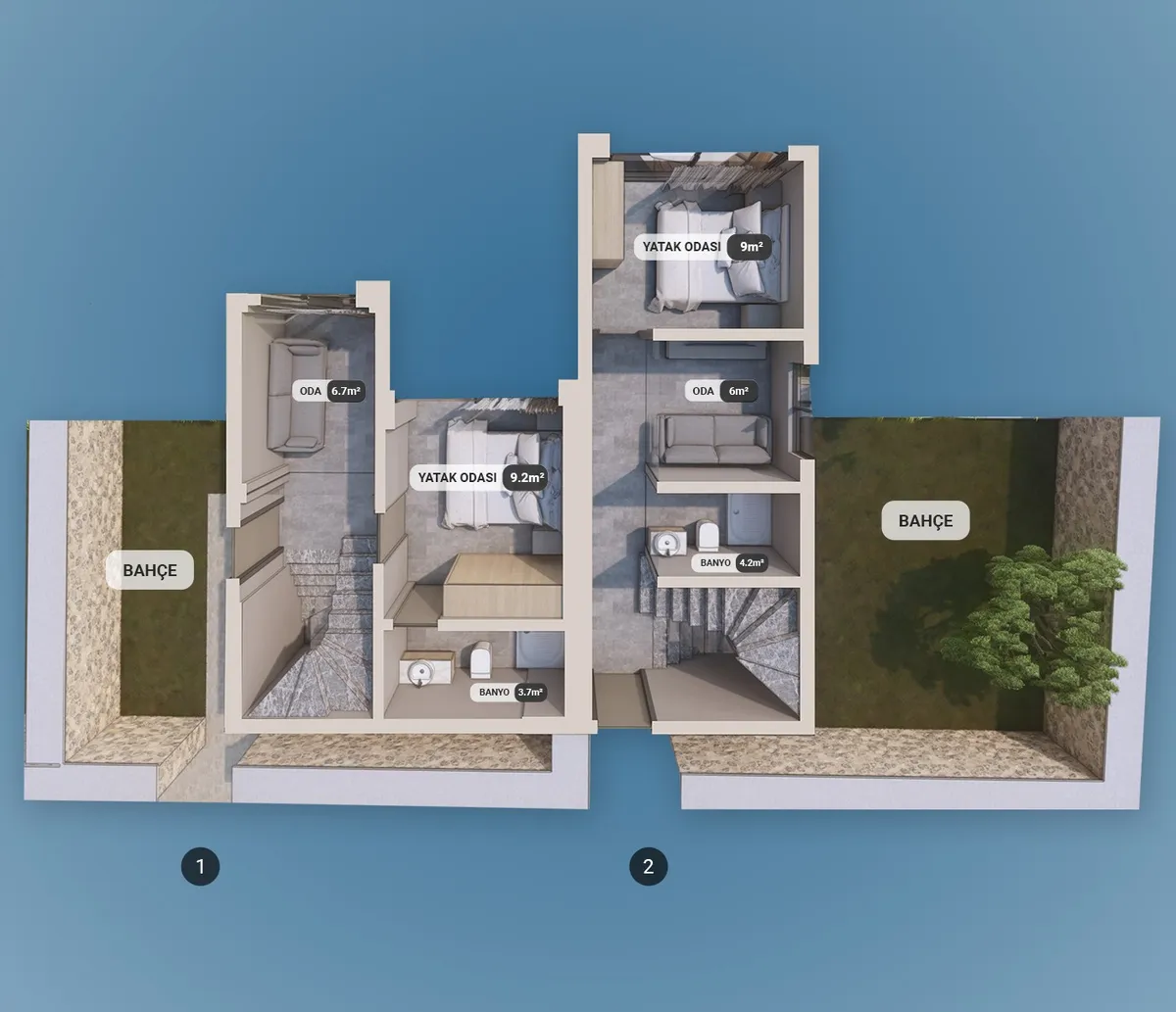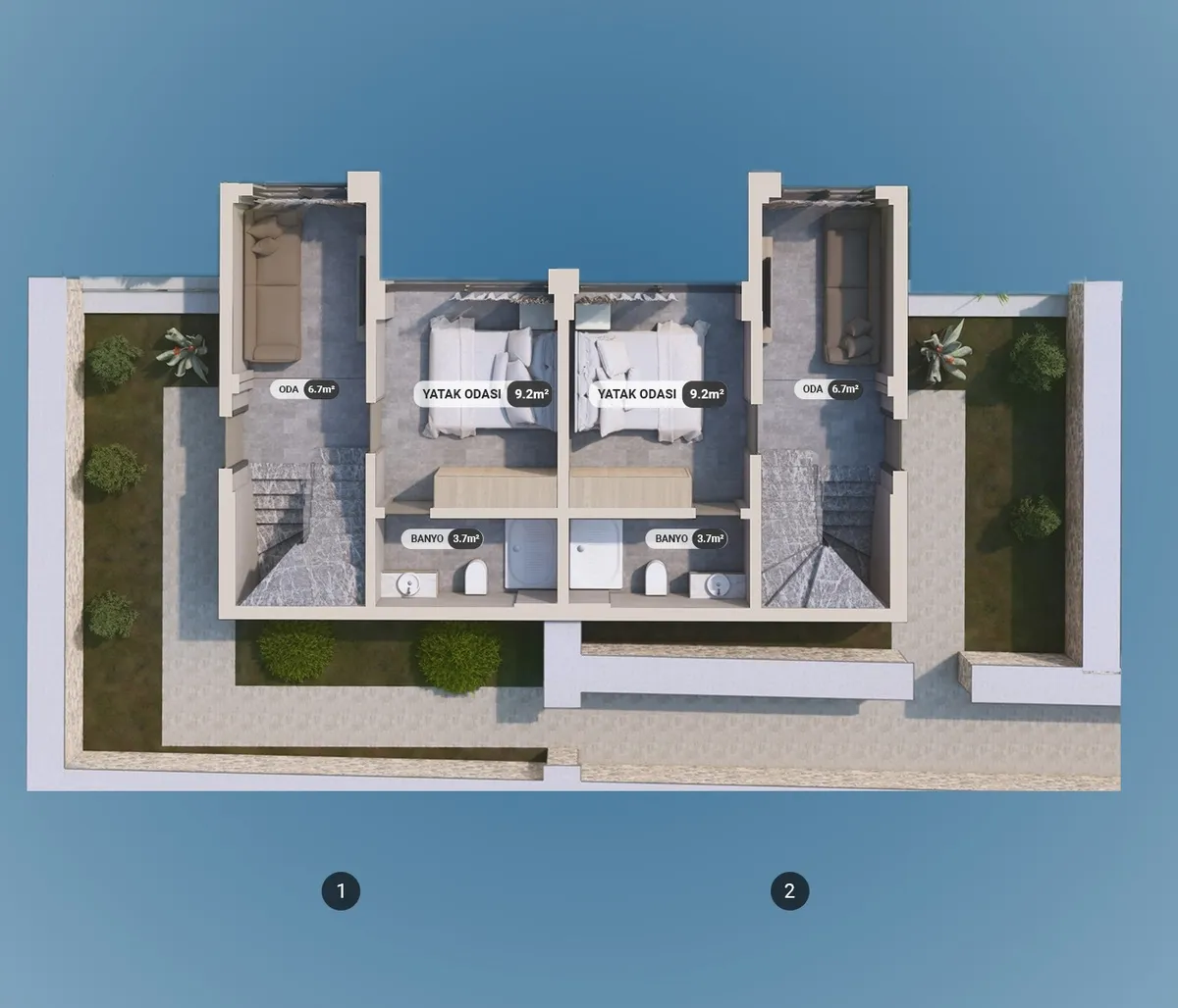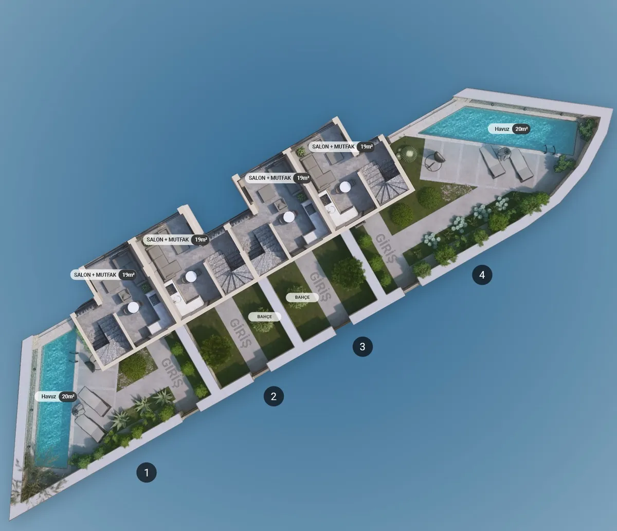 The project includes 12 villas spread across three plots, with a total construction area of 1,737 m². Designed in 2+1 and 2.5+1 configurations, each unit provides an independent entrance along with private outdoor space.