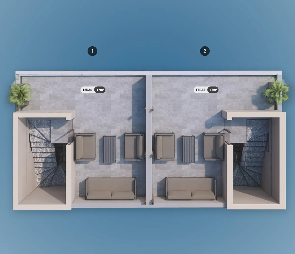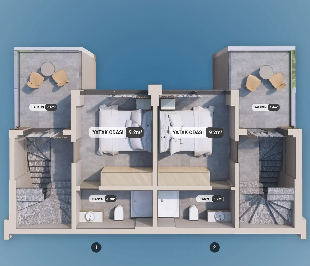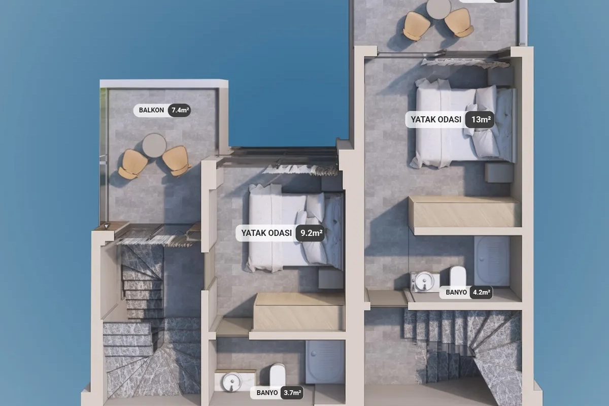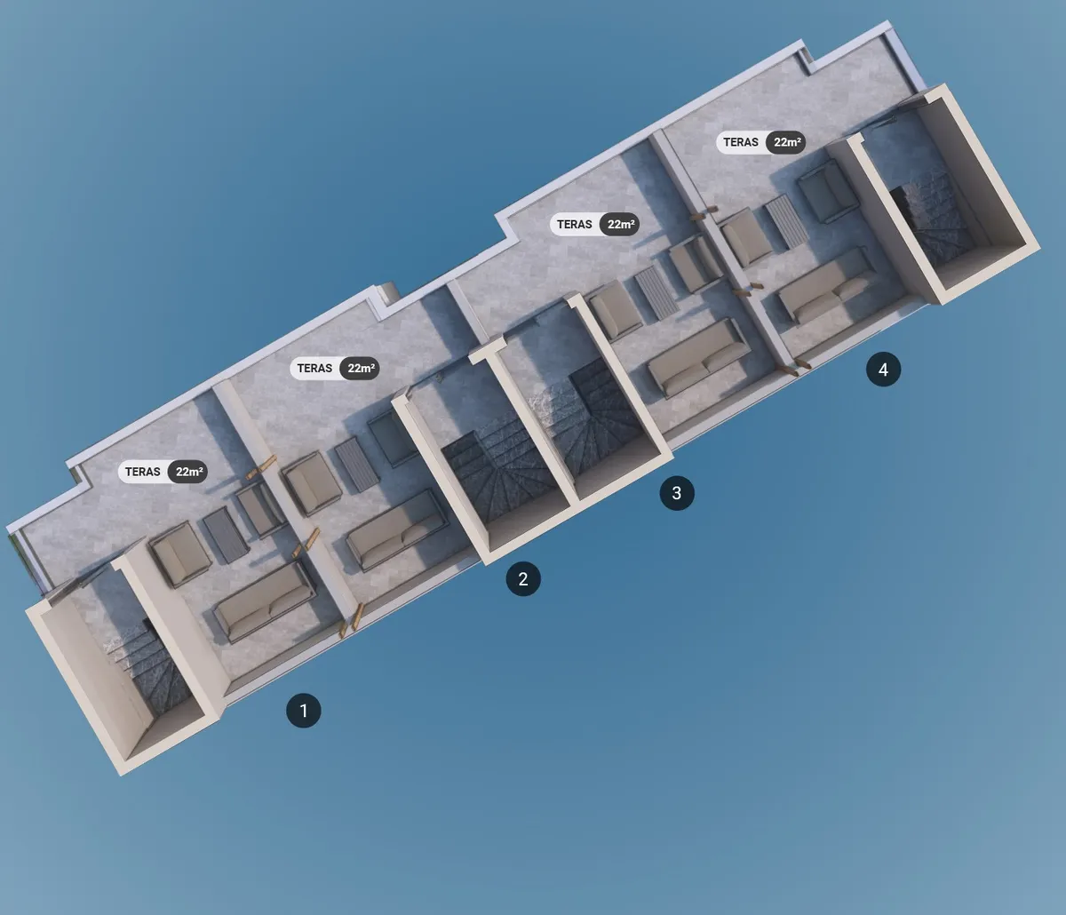 The project includes 12 villas spread across three plots, with a total construction area of 1,737 m². Designed in 2+1 and 2.5+1 configurations, each unit provides an independent entrance along with private outdoor space.