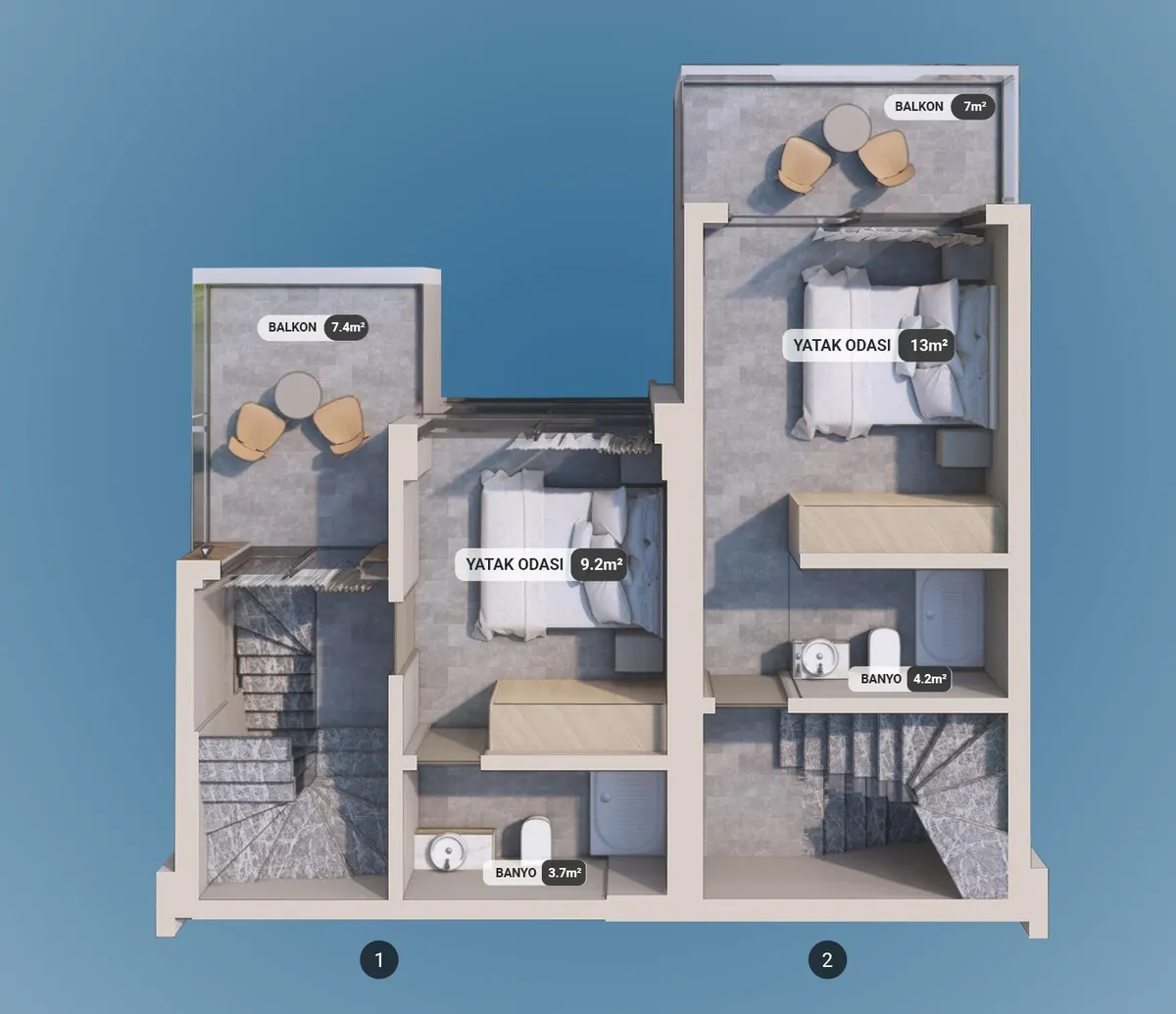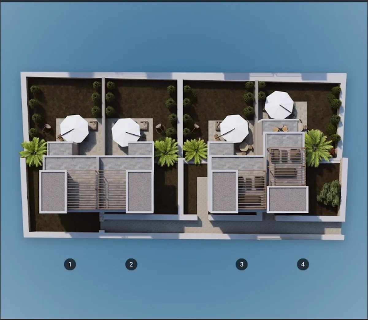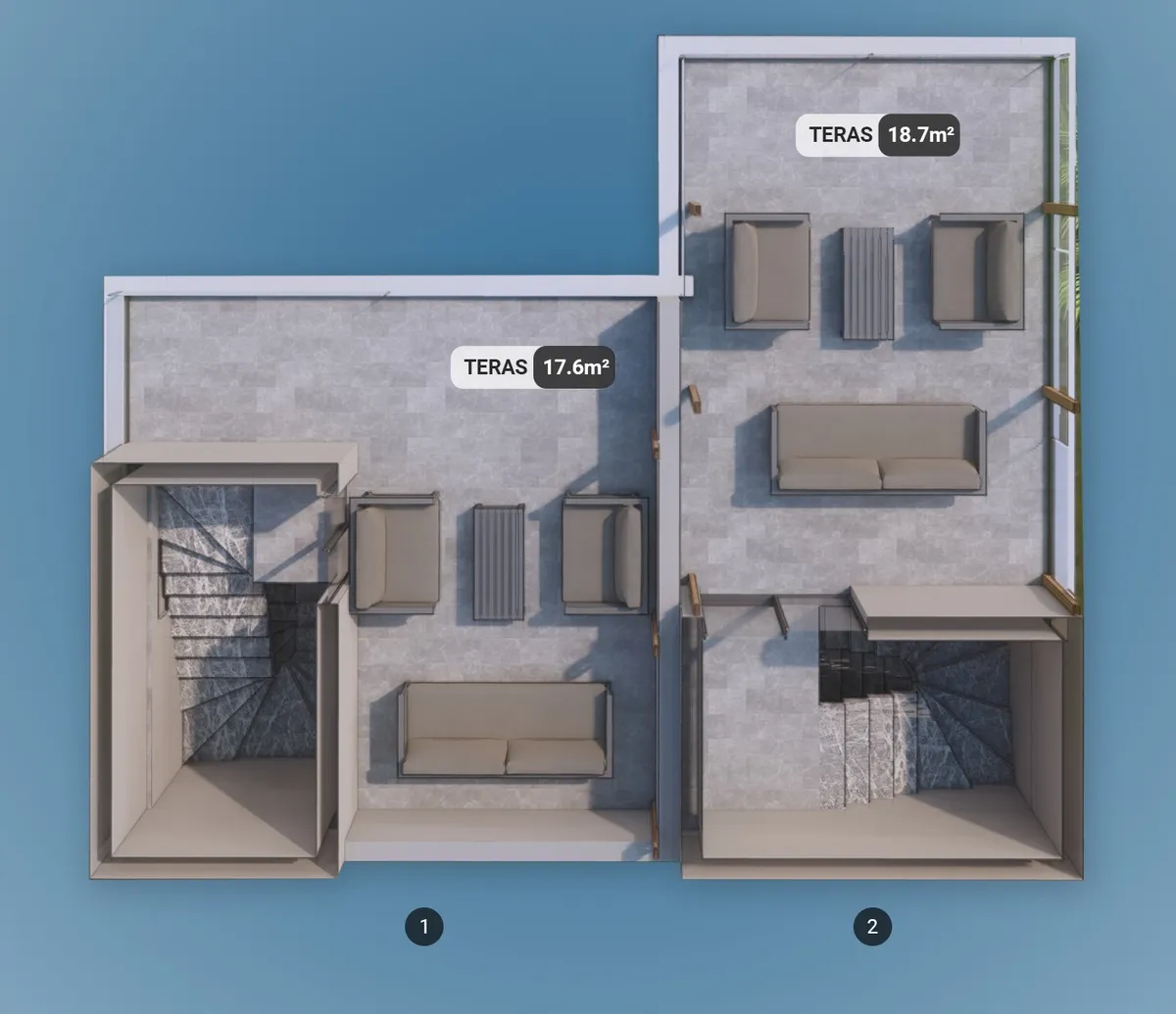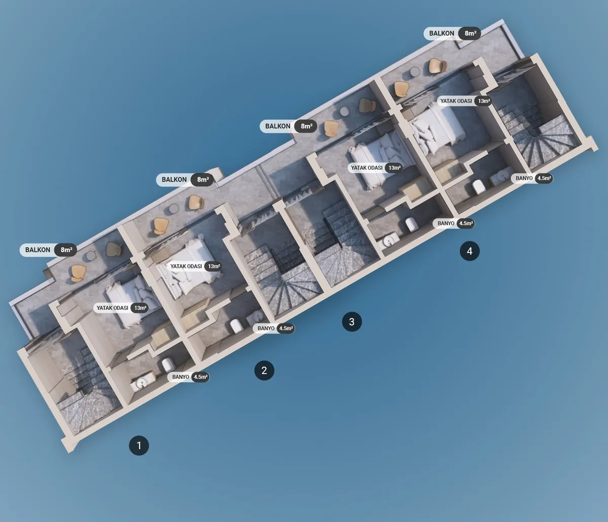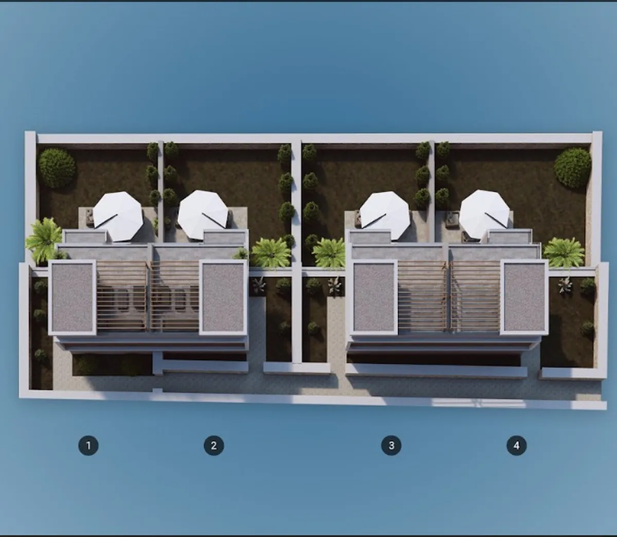 The project includes 12 villas spread across three plots, with a total construction area of 1,737 m². Designed in 2+1 and 2.5+1 configurations, each unit provides an independent entrance along with private outdoor space.