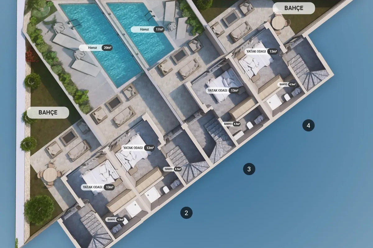 Positioned at the entrance of Kalkan, this contemporary villa development enjoys panoramic views of the sea and surrounding nature, offering an attractive opportunity for both investors and lifestyle buyers.