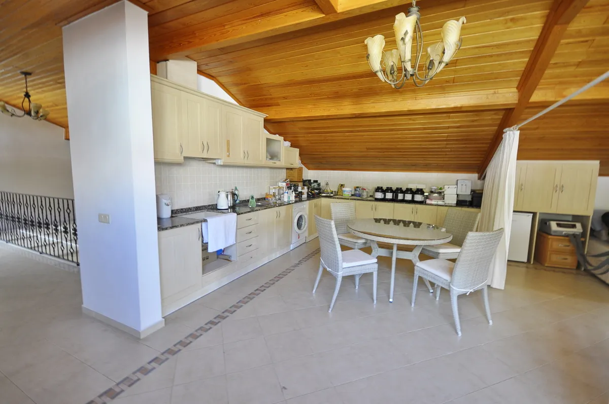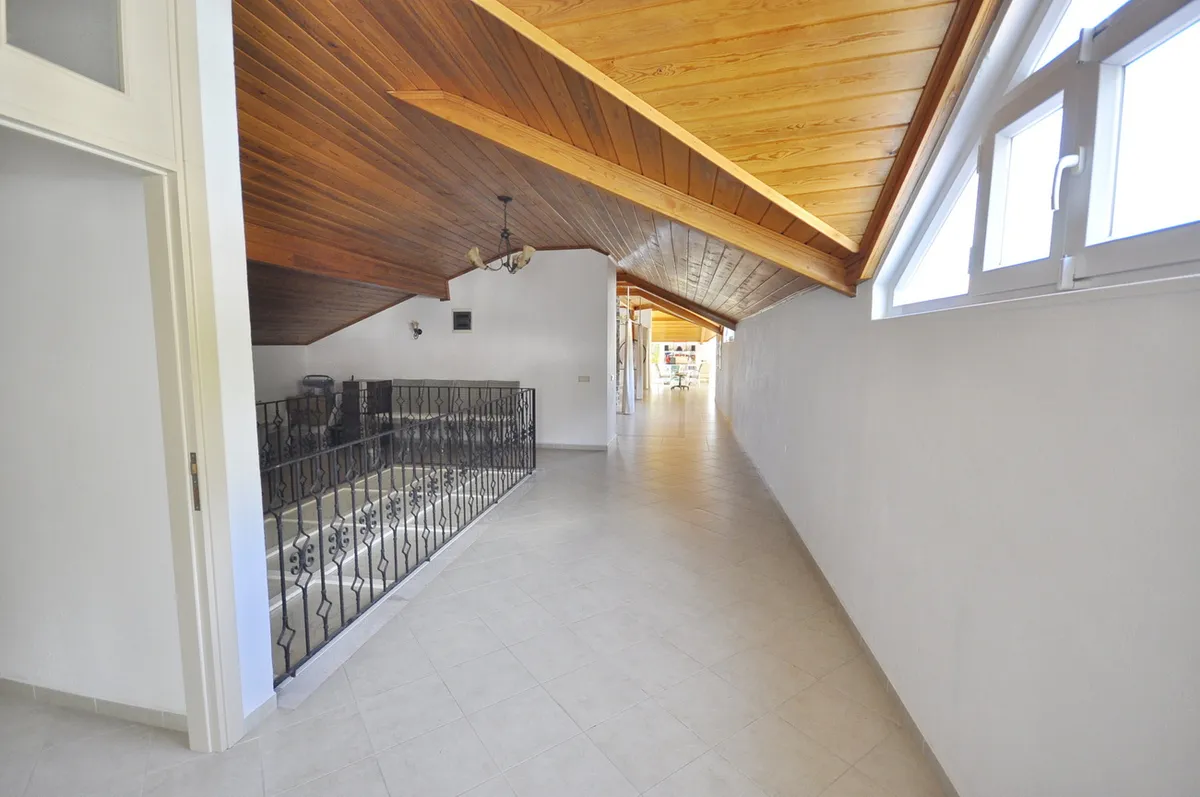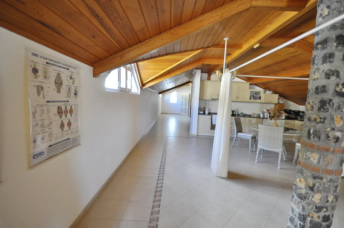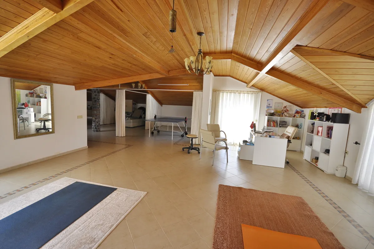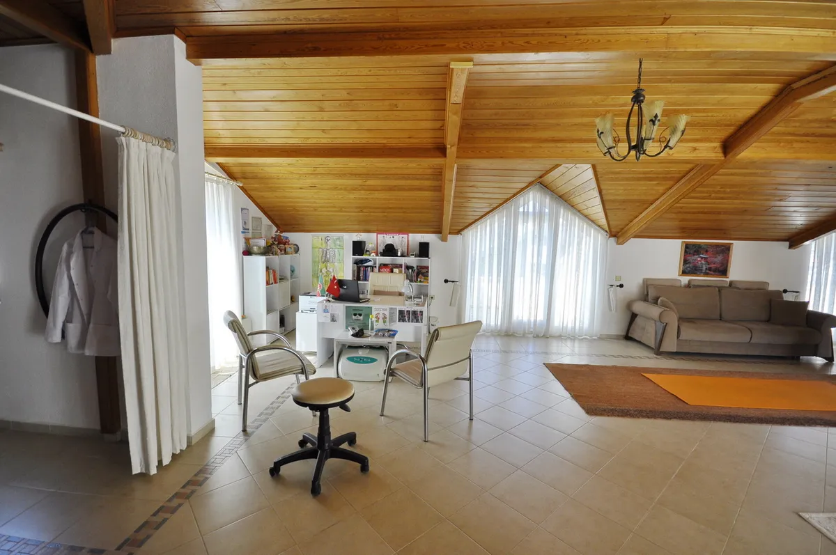 The attic floor is truly impressive, offering a vast open hallway, a second fully equipped kitchen, storage areas, an office space, and a cozy lounge with a fireplace/chimney. This floor boasts five balconies and roof terraces, perfect for enjoying mountain and pine forest views. The fourth bedroom, currently used as a massage room, includes its own en-suite bathroom.