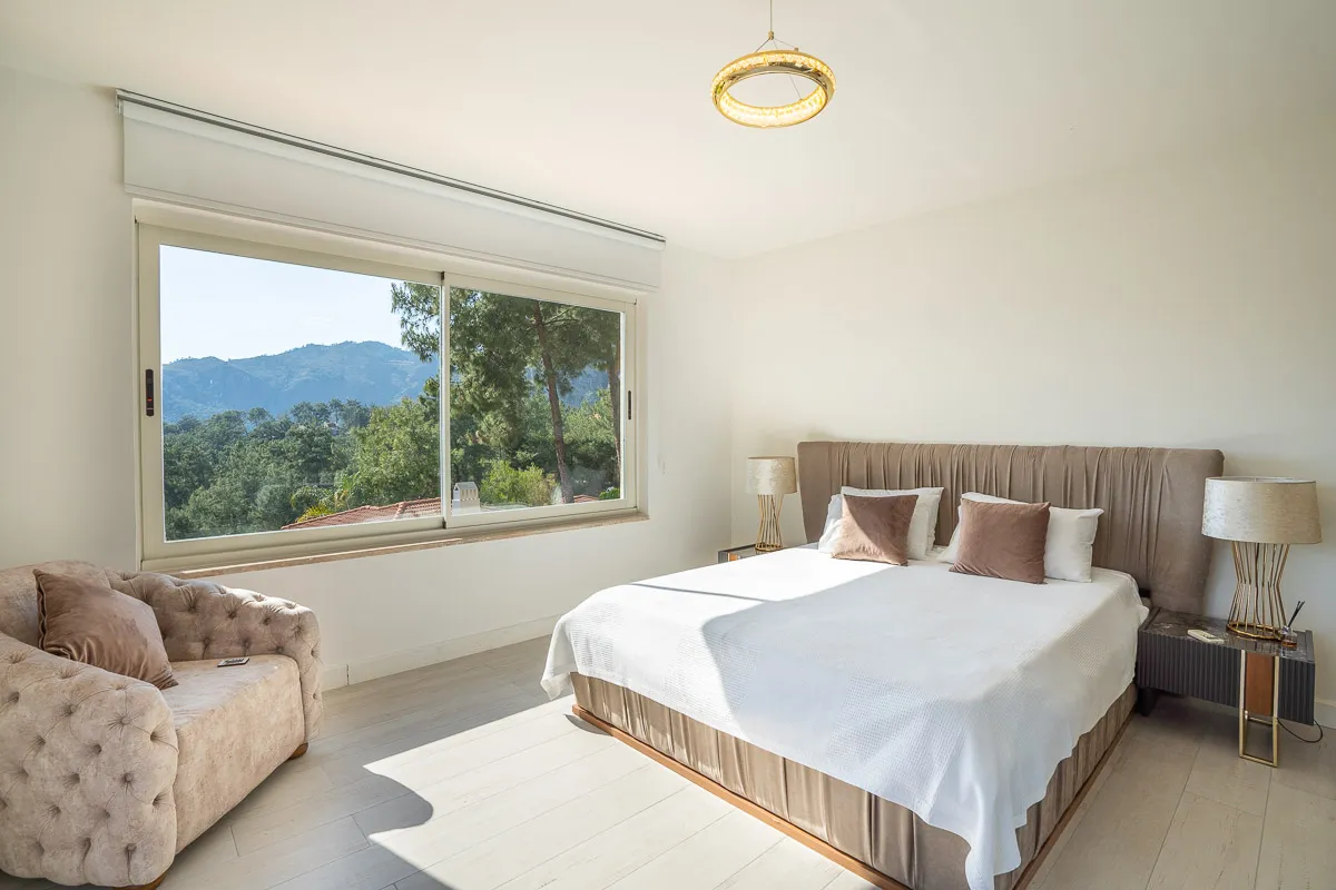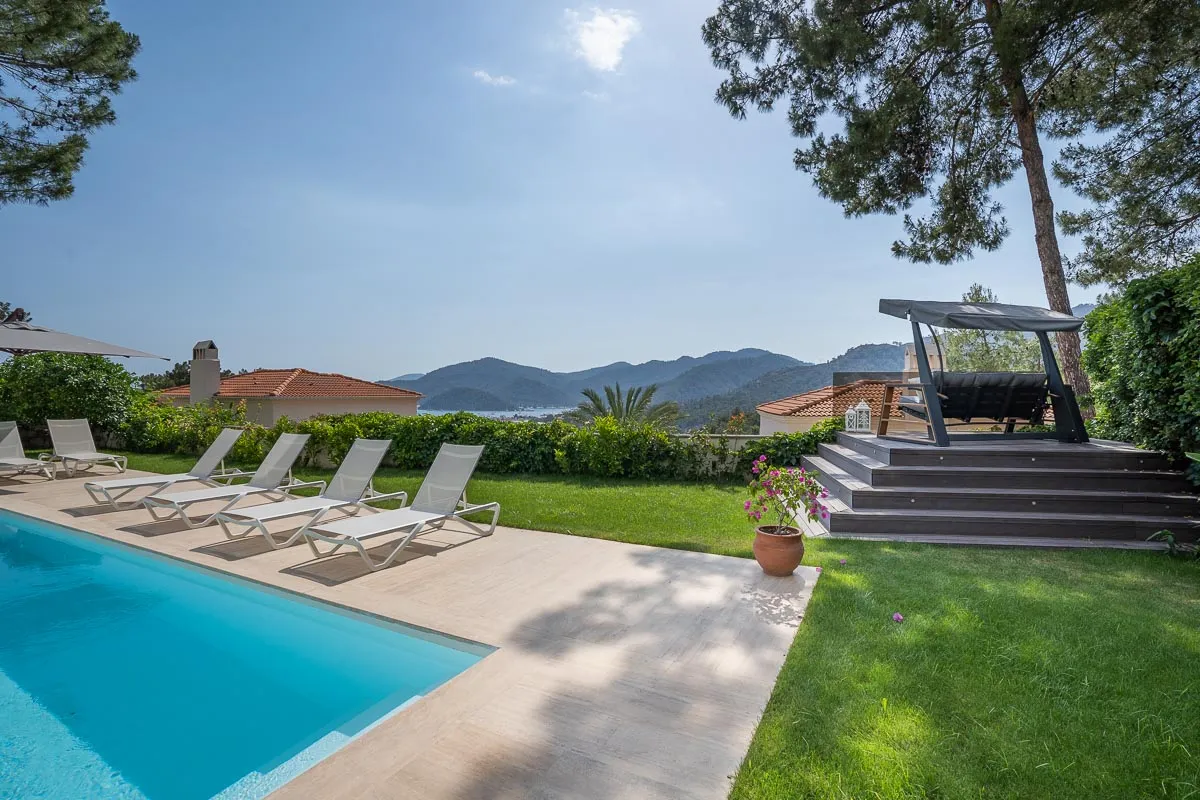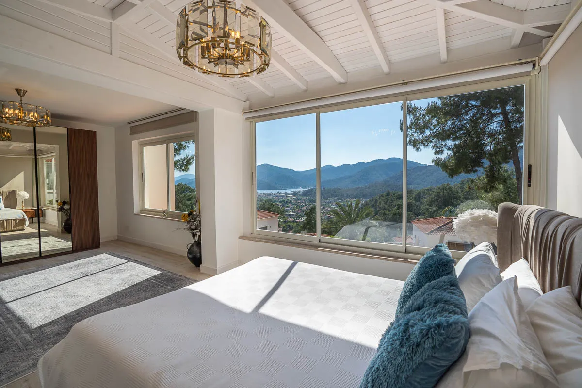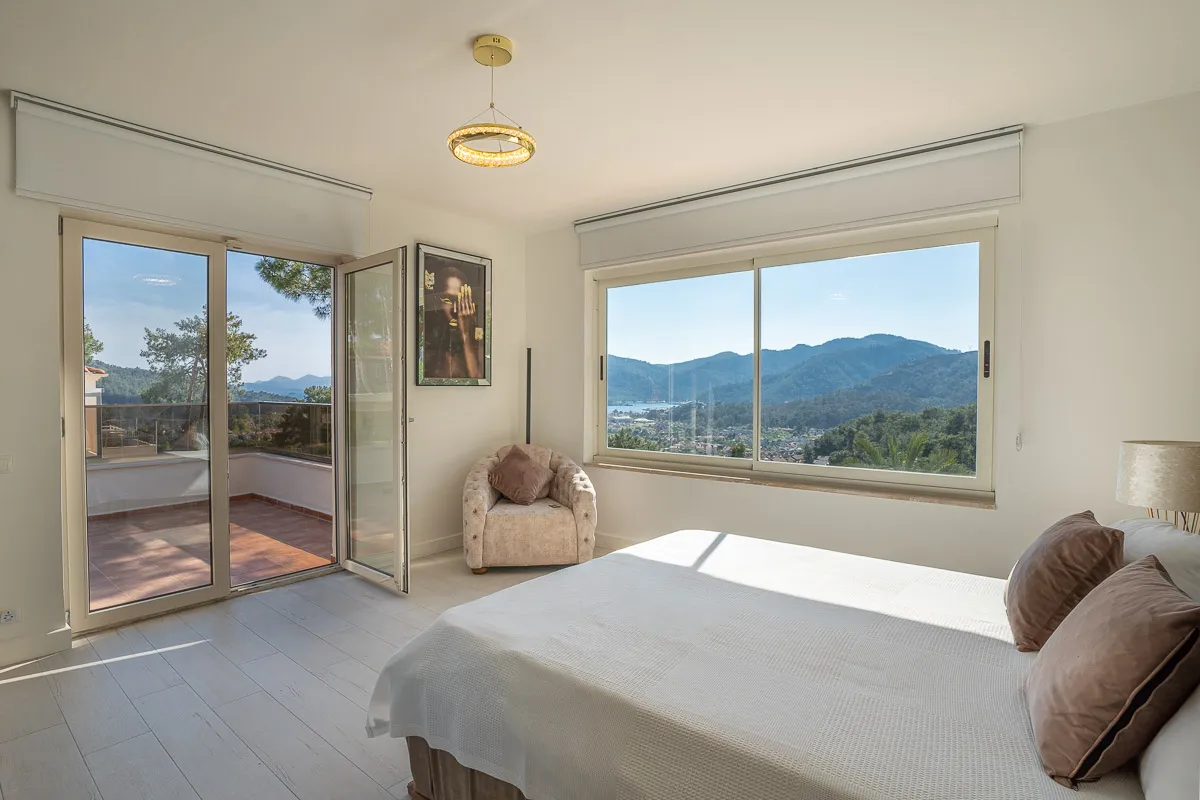 Эта элегантная вилла расположена на зеленых холмах Геджека, среди сосен, и сочетает в себе уединение, комфорт и захватывающий панорамный вид на море. На участке площадью 600 м² расположены 5 просторных спален, каждая с собственной ванной комнатой, а также частный бассейн, окруженный ухоженным садом.
