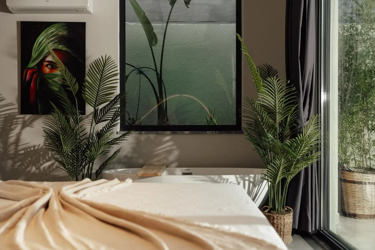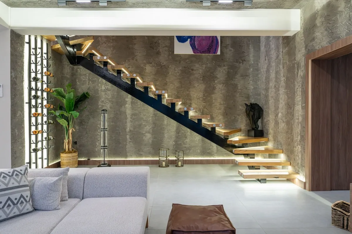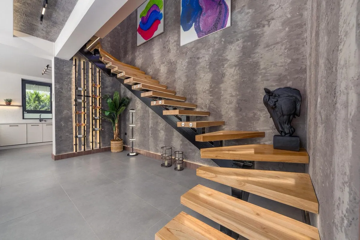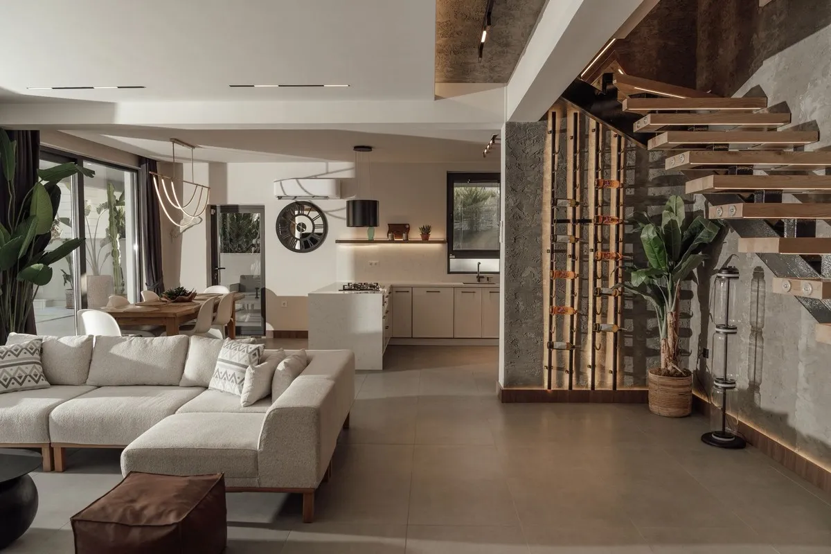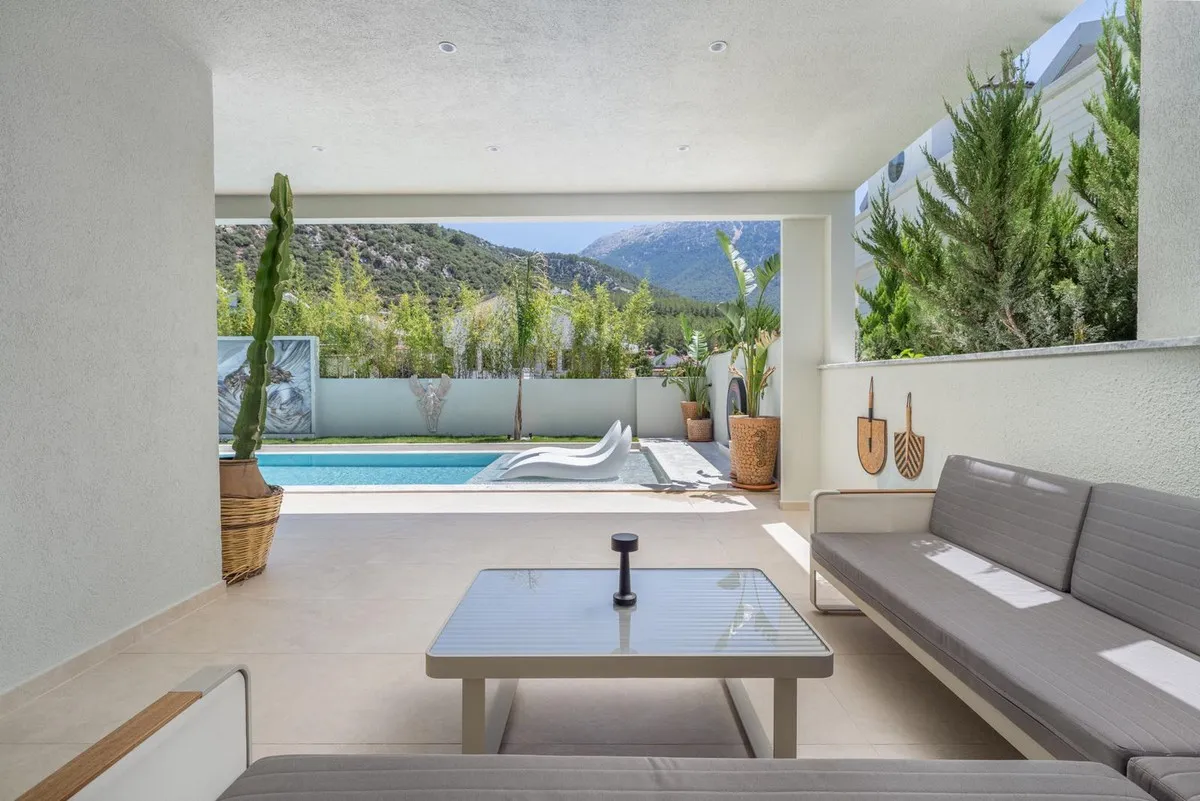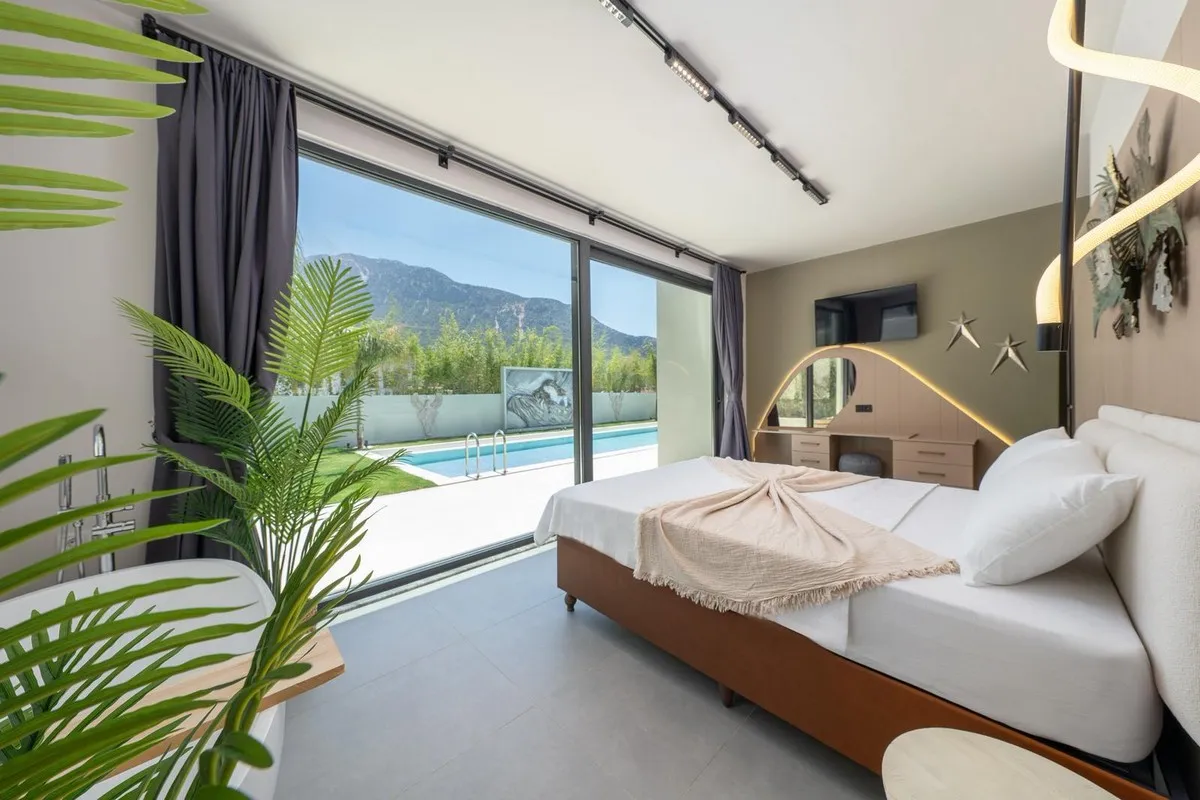 - Первый этаж: Просторная гостиная с высокими потолками, современная кухня открытой планировки, спальня с джакузи и видом на бассейн