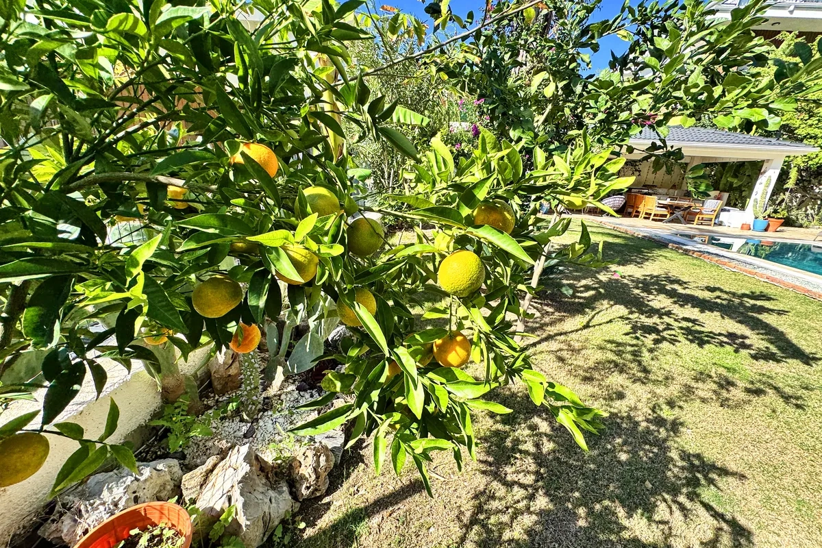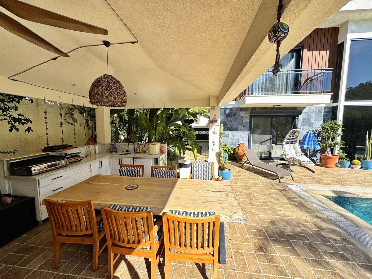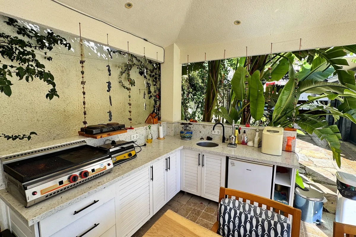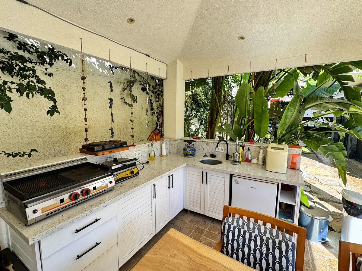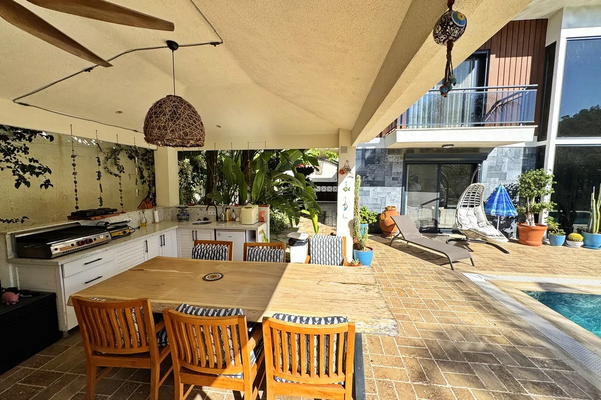 На территории виллы вас ждут: большой бассейн, зона для загара, каменный барбекю, летняя кухня с обеденной зоной, зона отдыха, кладовая и частная парковка.