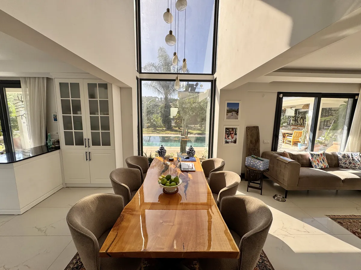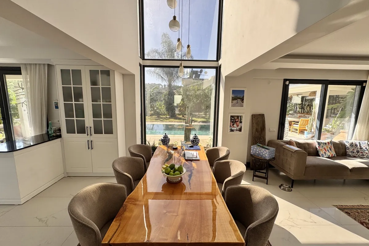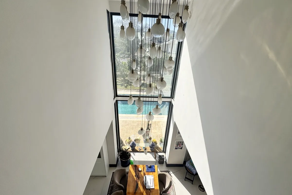На первом этаже расположена просторная гостиная с высоким потолком (атриумом), современная кухня с множеством шкафов, а также столовая зона, залитая естественным светом. Из гостиной и кухни можно выйти на частный бассейн и в зелёный сад. Также на этом этаже есть гостевой туалет.