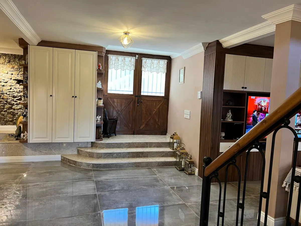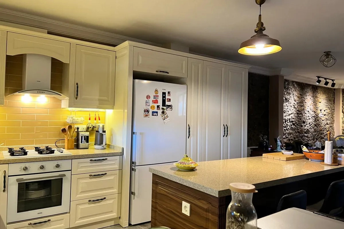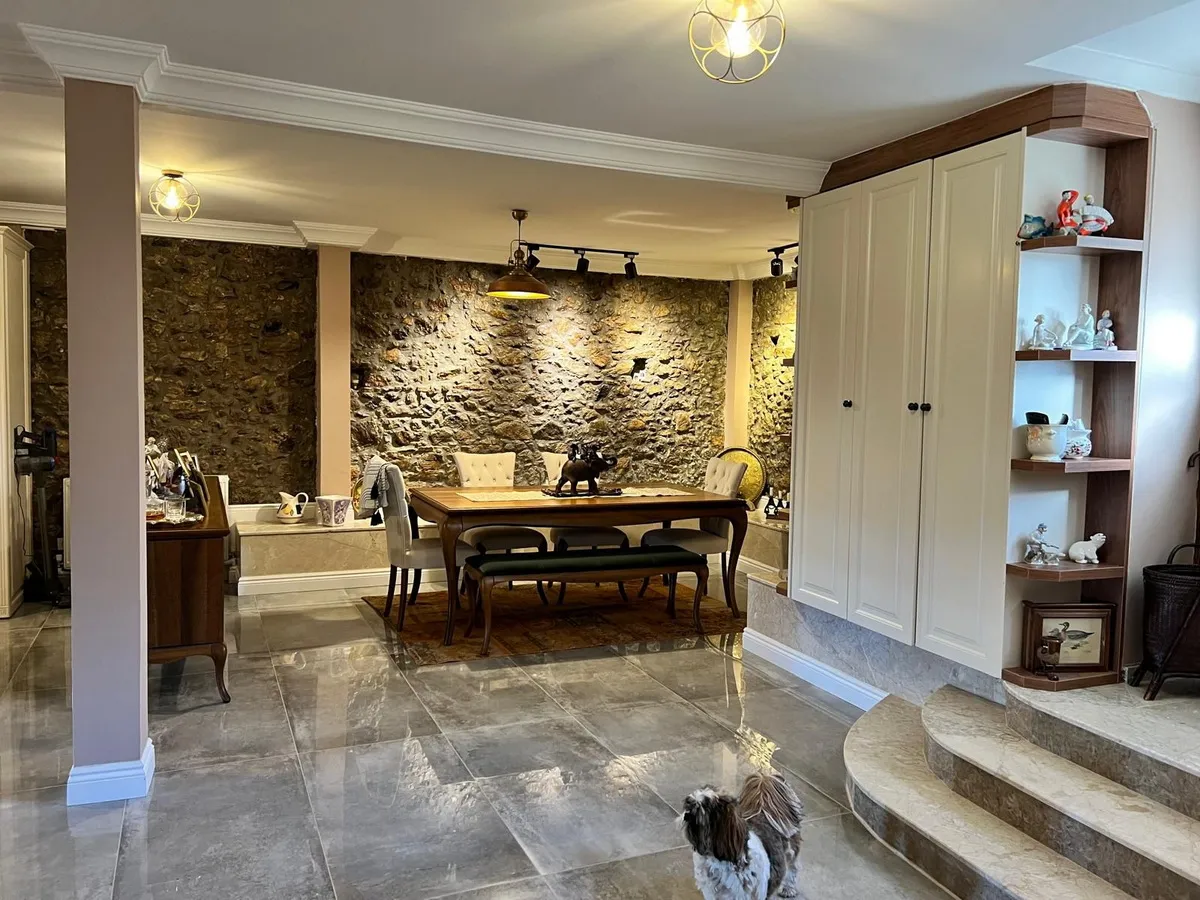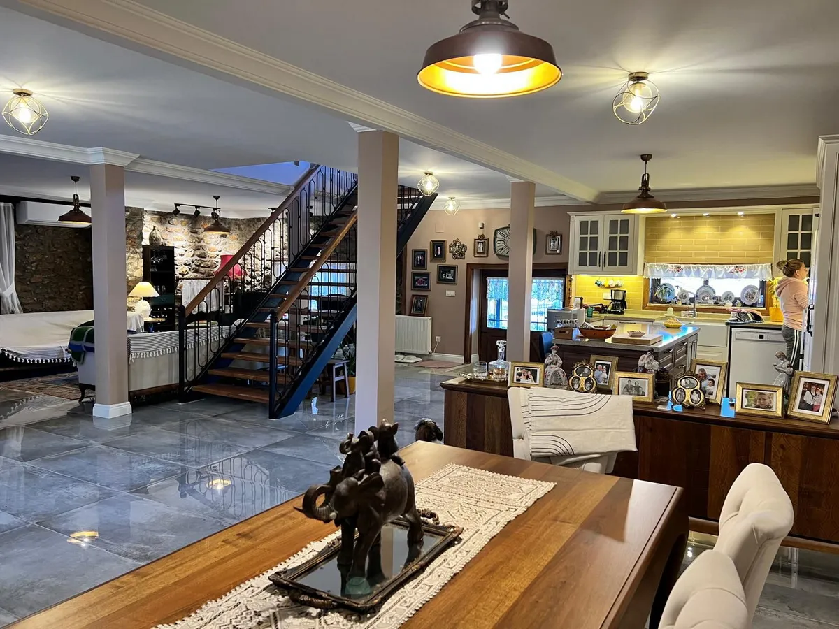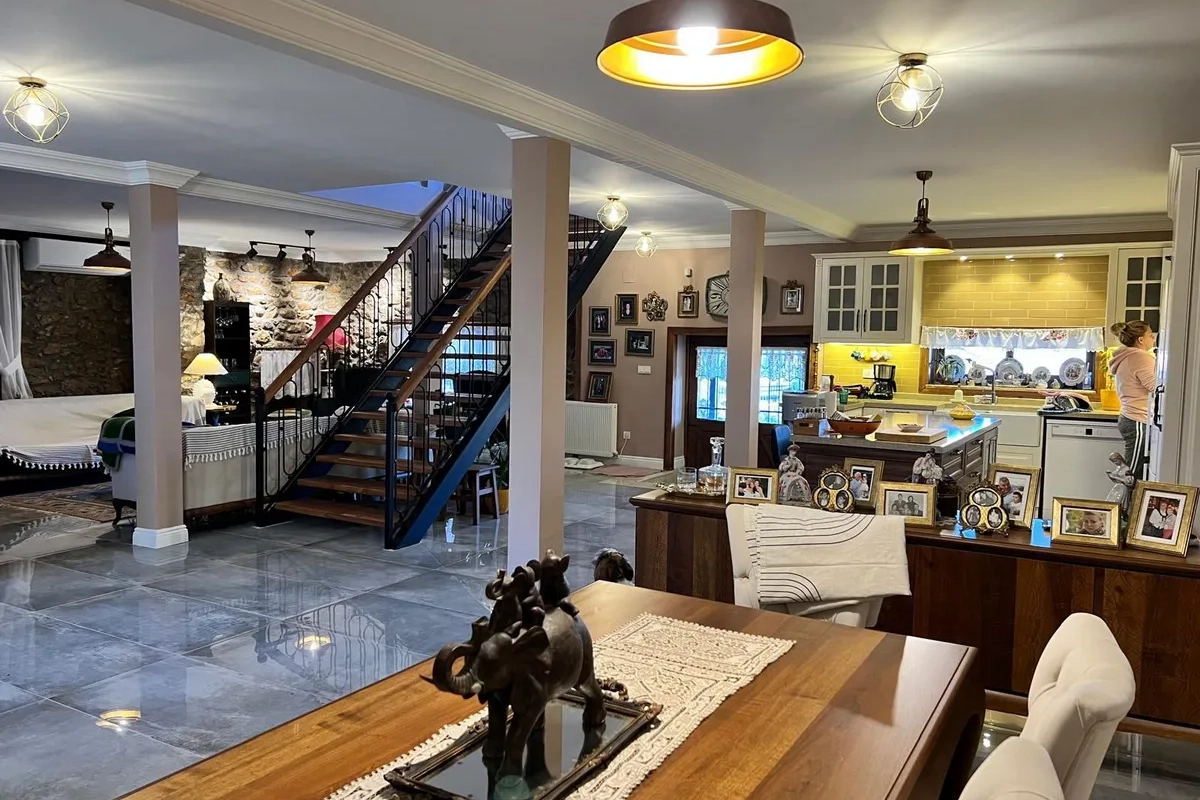 На первом этаже — кухня открытого типа с островом, уютная гостиная с каменными стенами, гостевой туалет и второй этаж с традиционным эркером и зоной отдыха.