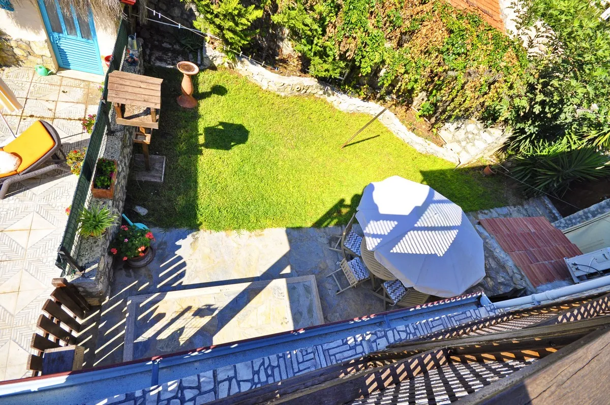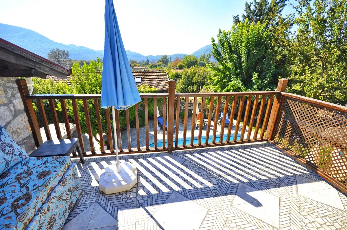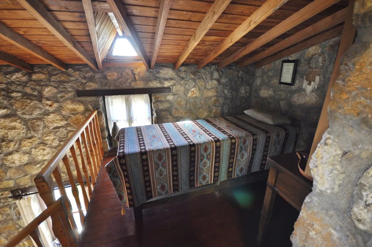Üst Kat: Açık bir hol (çalışma alanı olarak kullanılabilir), ikinci bir oturma odası, geniş bir yatak odası ve küvetli banyo yer almaktadır. Üst kattaki özel teras, Kayaköy vadisinin ve tarihi kalıntıların büyüleyici manzarasını sunar.