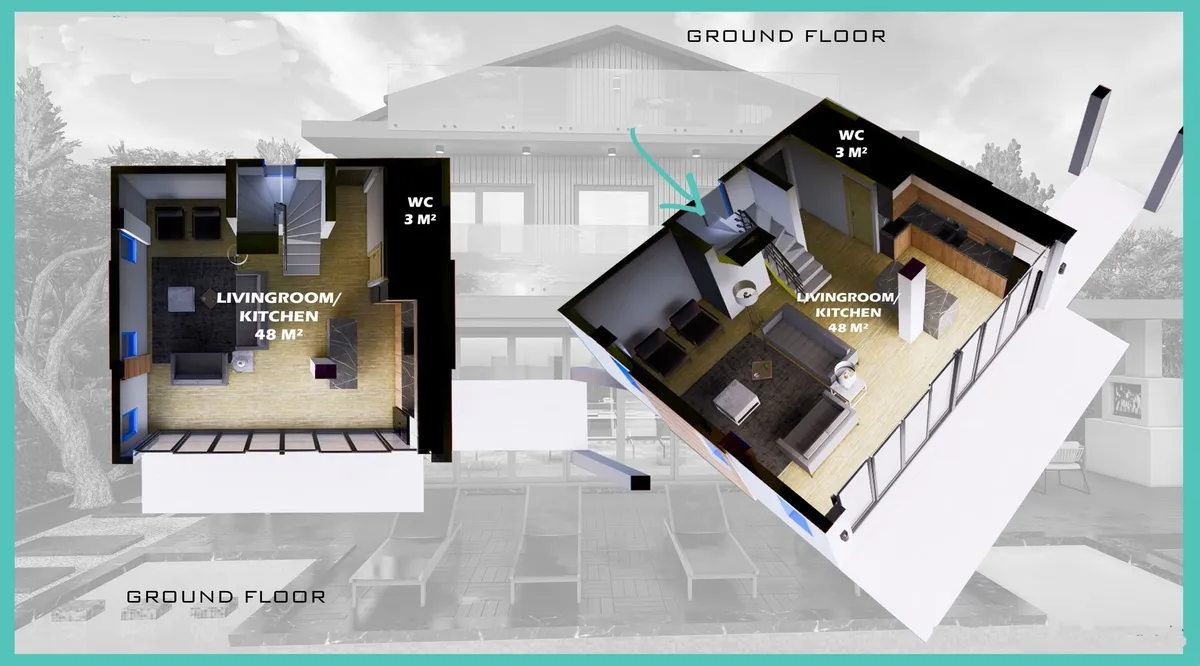 Villaya girişte geniş bir antre, misafir WC ve büyük bir açık plan mutfak & salon alanı karşılar. Villanın ön cephesi boyunca uzanan geniş teras, özel yüzme havuzu ve bahçe alanına bakar ve dış mekân keyfi için mükemmel bir yaşam alanı sunar.