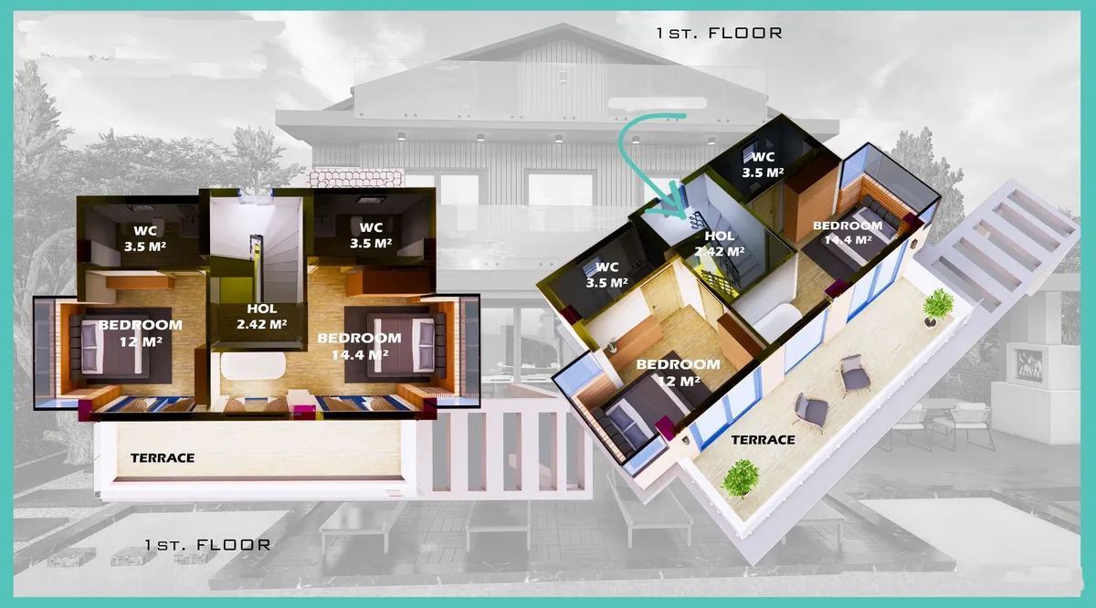 Birinci Kat: 2 geniş çift kişilik yatak odası , Her birinde ebeveyn banyosu , Ortak geniş balkon