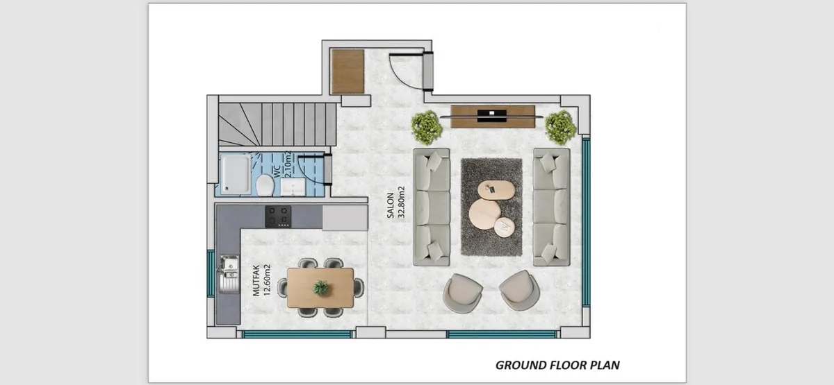 Zemin Kat: Geniş giriş holü ve vestiyer , Ferah açık plan salon , Tam donanımlı modern mutfak , Yemek alanı ve ön terasa çıkış , Ortak kullanım banyosu , Havuz ve bahçeye bakan geniş teras