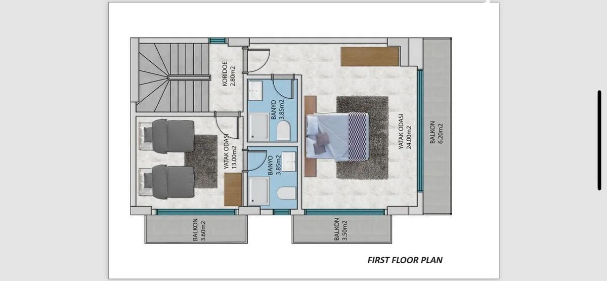 Birinci Kat : 2 adet çift kişilik yatak odası , Her odada özel banyo ve balkon